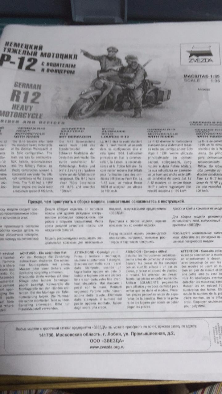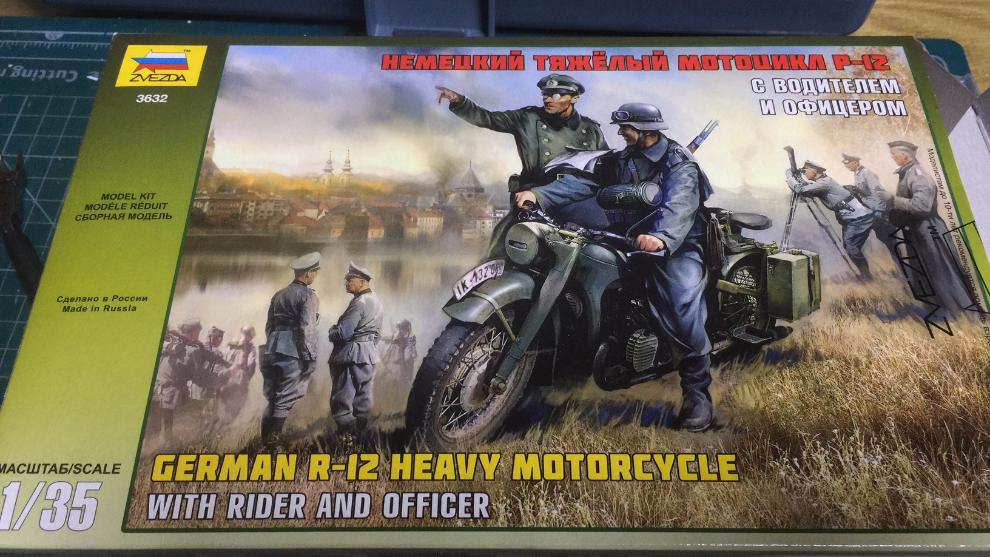 이번에 만든 건 러시아 메이커 즈베즈다의 German R-12 Heavy Motorcyle with Rider and Officer 입니다. R-12 오토바이 한대 그리고 오토바이병하고 장교 인형2개로 구성이 되어 있습니다.