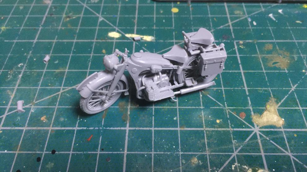일단 조립만 한 상태의 사진입니다. 아직 파팅라인은 안 다듬어서 투박해 보이긴 하지만 사진에서 보듯이 옷의 구김 같은 질감 표현이 아주 좋습니다. 오토바이 디테일도 좋은 것 같고요. 이번 제품의 경우 소총을 메고 있어서 따로 스트랩 제작 같은건 안해도 되서 편하네요.