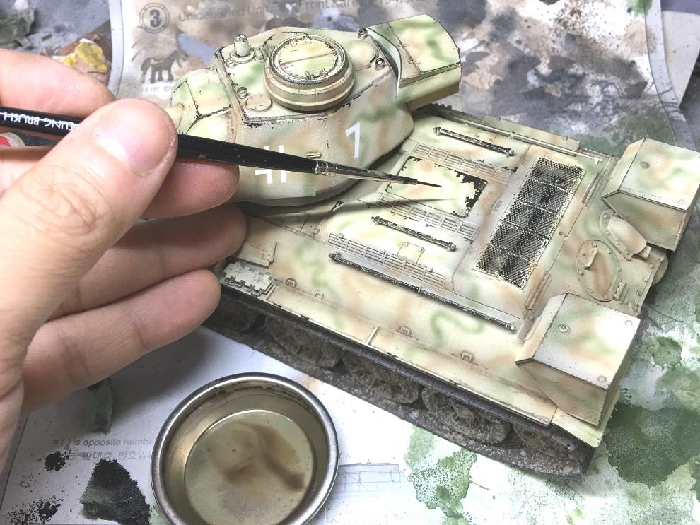 데칼링, 마킹까지 끝나면 유화물감 로우엄버를 묽게 희석해서 핀워싱해줍니다