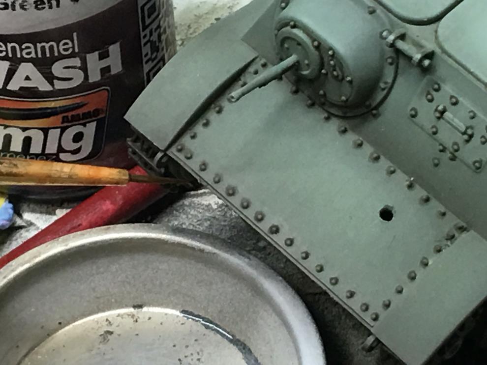 사진과 같이 초콜릿색 에나멜로 핀워싱을 해줍니다, 볼트하나하나 그늘진 라인에 거짓음영을 넣어 디테일을 최대한 살려주는 작업입니다