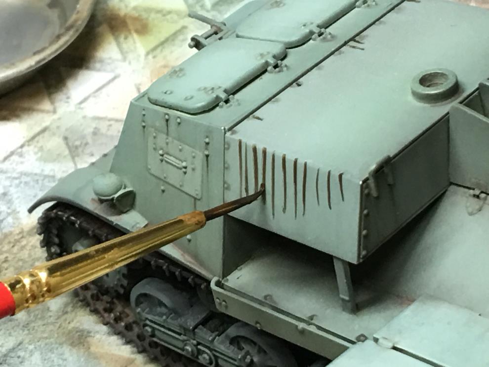 중력에 의한 녹, 땟물 표현도 사진과 같이 에나멜 또는 유화도료를 묻힌 후 중력방향으로 쓸어내려줍니다