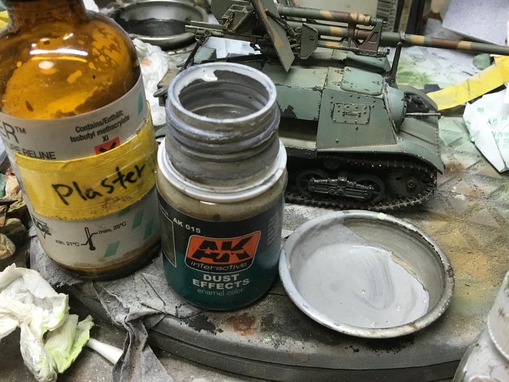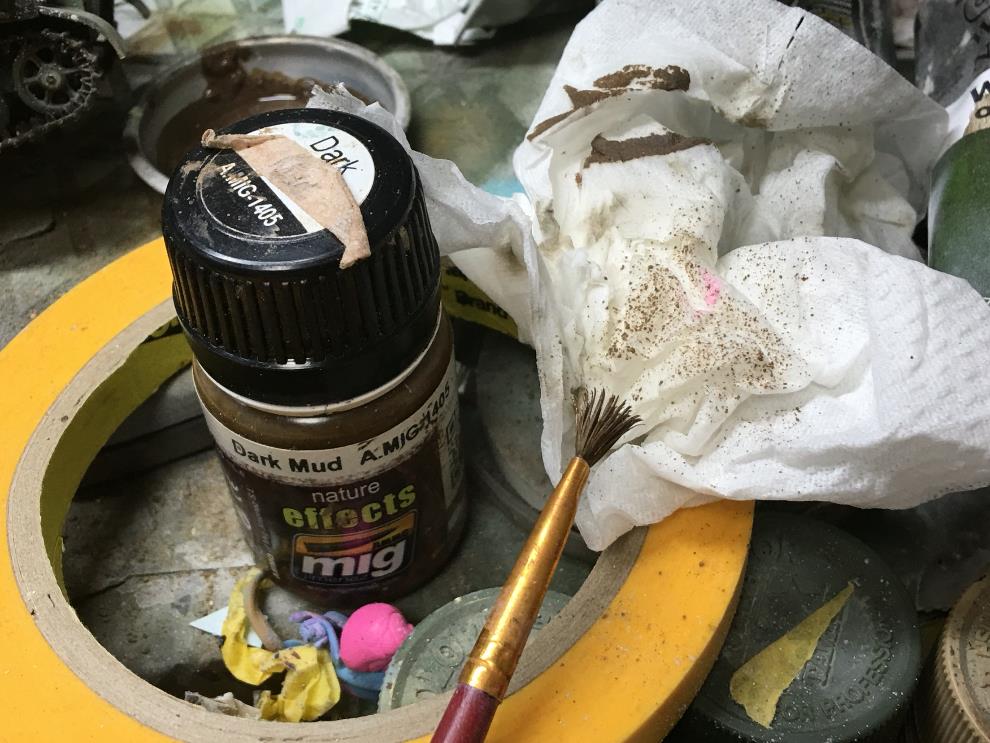 밝은색의 흙탕물 표현을 한 뒤, 역시 어두운색 표현제를 석고가루에 섞어 다시 튀겨준 뒤