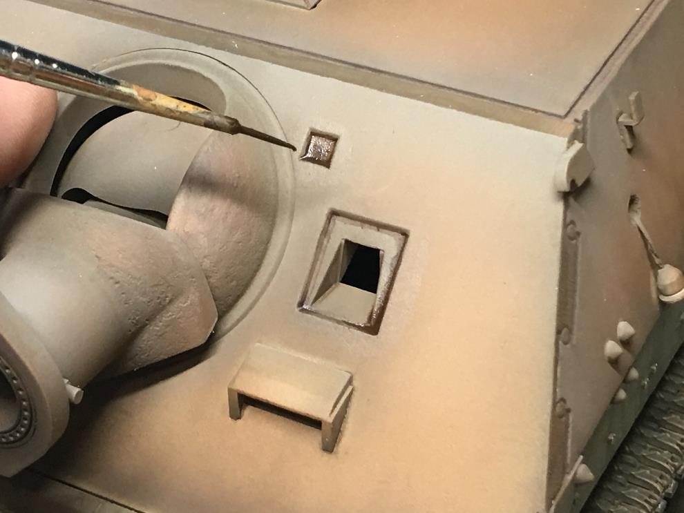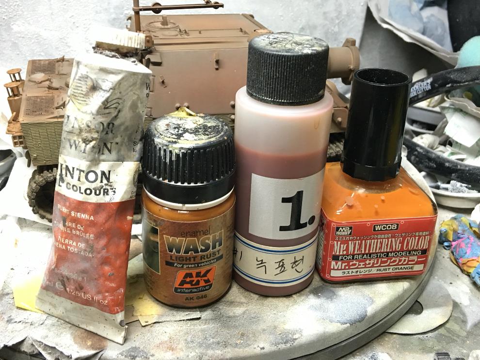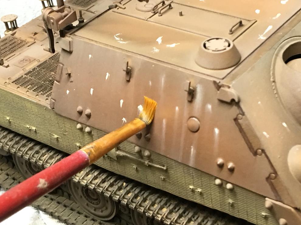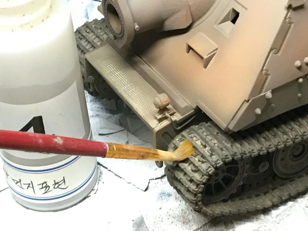이 작업은 기본색이 아크릴일 경우 유화로 점을 찍고 바로 붓으로 웨더링 해주셔야 할겁니다