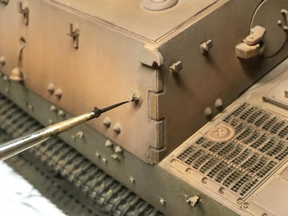 어두운 계열 에나멜을 붇힌 붓으로 디테일 하나하나 핀워싱 해줍니다