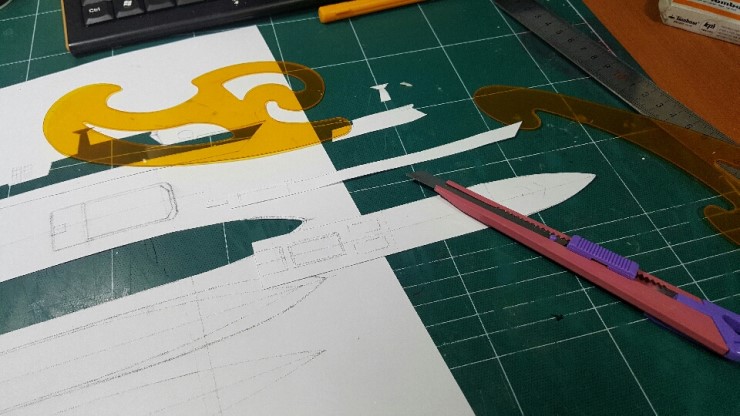 잘라낸 도면을 딱풀을 이용해 프라판에 붙이고 그대로 오려냅니다.