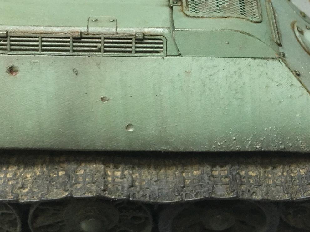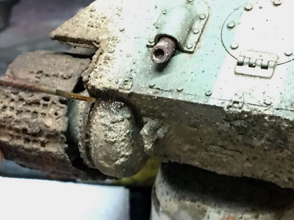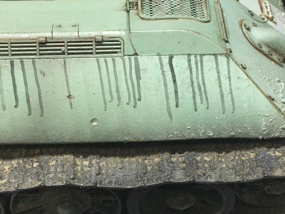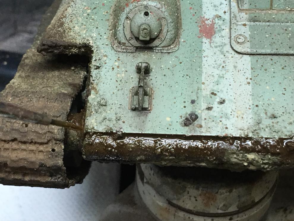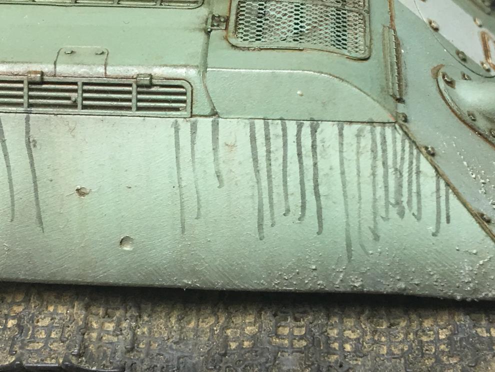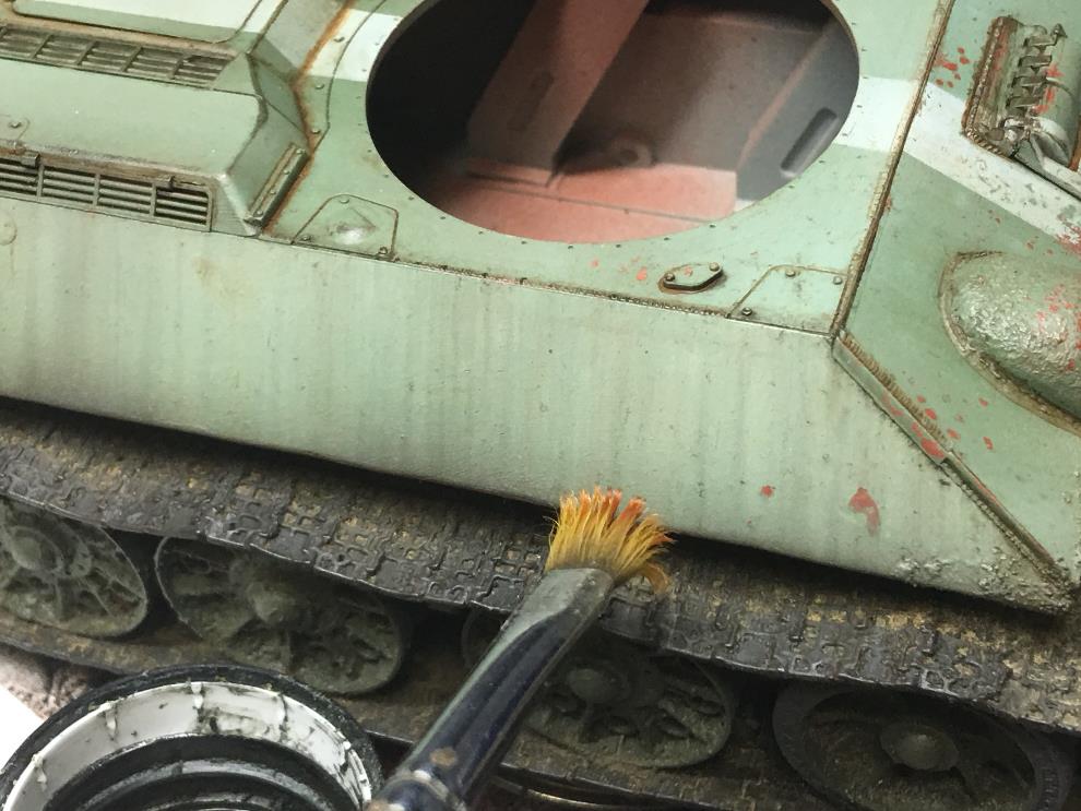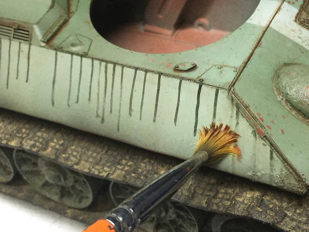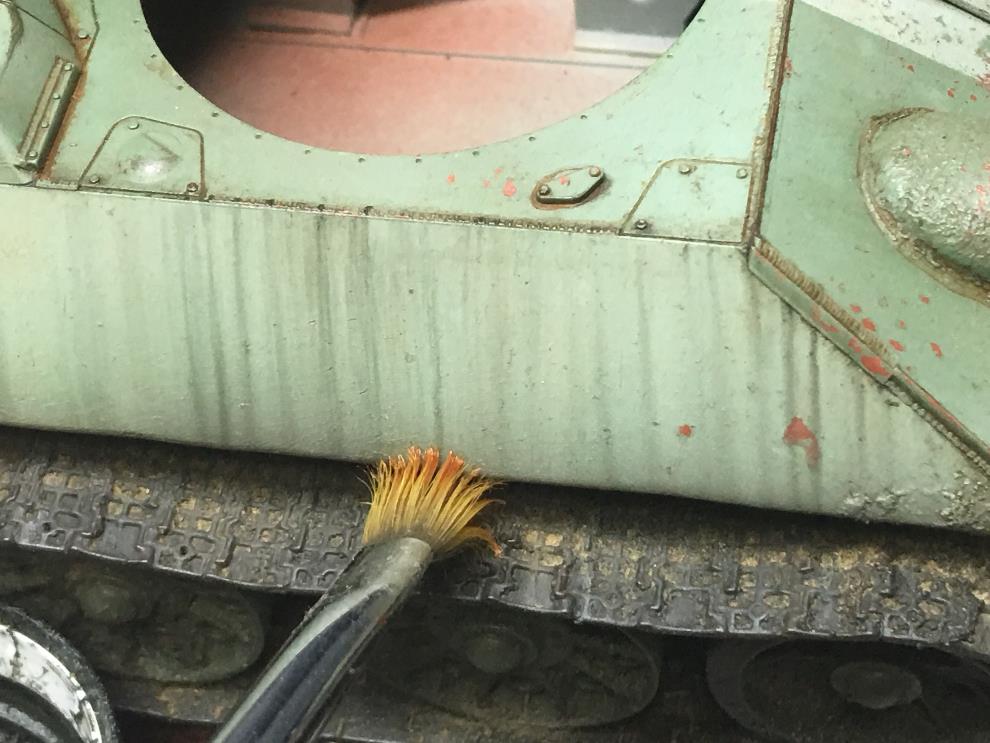 T-34 측면에 있는 오일배기구는 유화물감으로 그려준 뒤, 살살 바깥쪽으로 약하게 블랜딩해줍니다