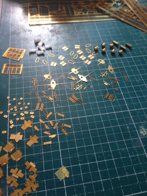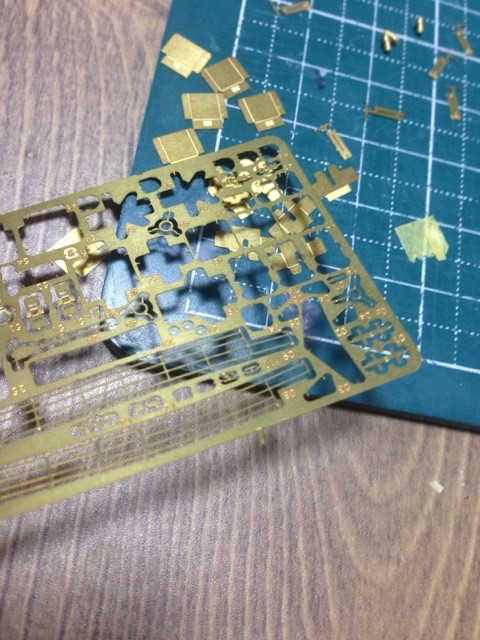 접사가 잘 안되서 잘 안보이는데 밧줄고정대 활동 가공 부품을 에칭에 붙일때 런너에 붙어있는 상태로 작업을 했습니다.
