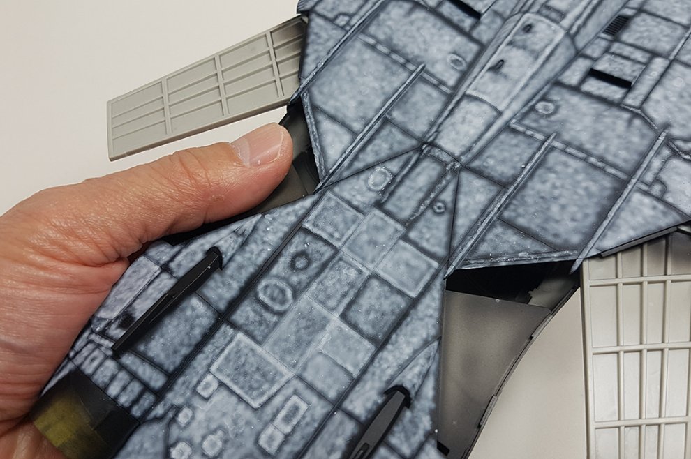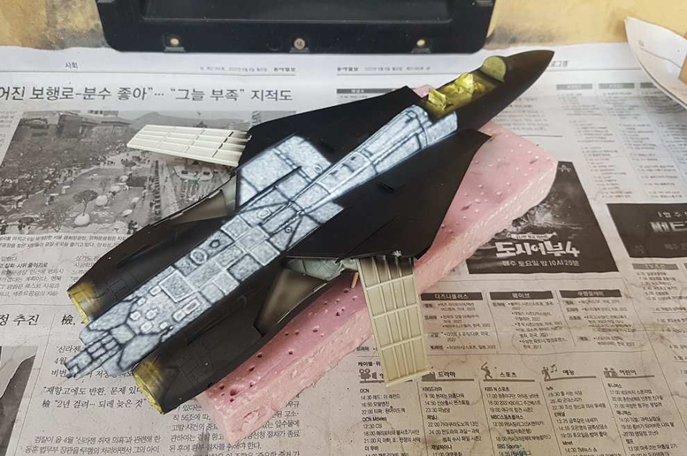 먼저 블랙 서페이서로 전체 도색하고 기체 표면의 얼룩을 표현하기 위해 흰색으로 얼룩덜룩 칠해주었습니다.