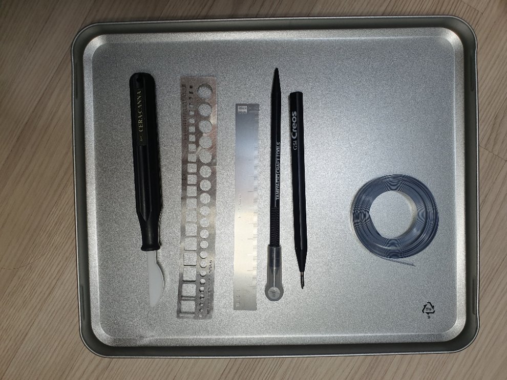 선파기 도구는 GSI 크레오스 초경0.15mm 엔그레이버,타미야 초경 엔그레이빙 니들,조형촌의 세라칸나(세라믹 나이프) 벨린덴 사 제 템플레이트, 하세가와 사 제 에칭 자, 모덱스 테이프 를 준비했습니다.