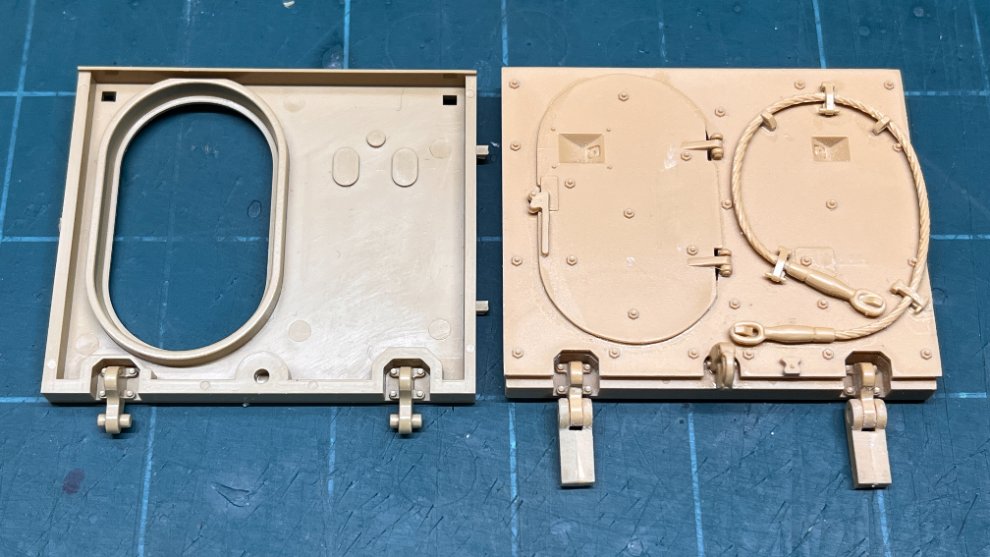 실제로 Tamiya의 Bradley는 후방램프해치의 힌지구조가 반대로 설계가 되어있습니다. 사진 좌측의 해치에 붙어있는 부분의 힌지는 거꾸로 두개의 구멍이 있는 형태인데, 곰곰이 생각해보면 금형으로 사출하는 키트를 최소의 부품으로 만들려면 이 방법밖에 없겠다고도 생각이 들더군요. 사진 우측의 해치는 원래 M2A0용으로 만들었던 것이고 힌지를 갓핸드 니퍼로 도려낸 후 절단면도 평평하게 다듬어두었었는데, 그때도 무슨생각인지 잘라낸 부품쪼가리를 버리지 않고 있었던터라 도로 붙여서 원래의 구조대로 만들었습니다. 아무리 생각해도 문을 열어놓으면 보이지도 않는데, 저걸 만드느라 시간을 쓸 여유가 없더군요.