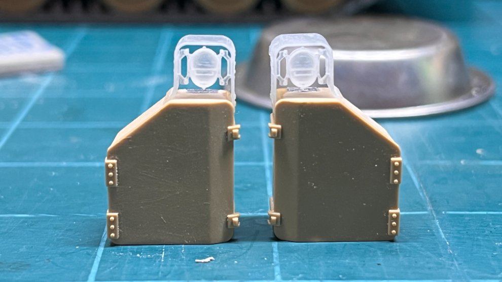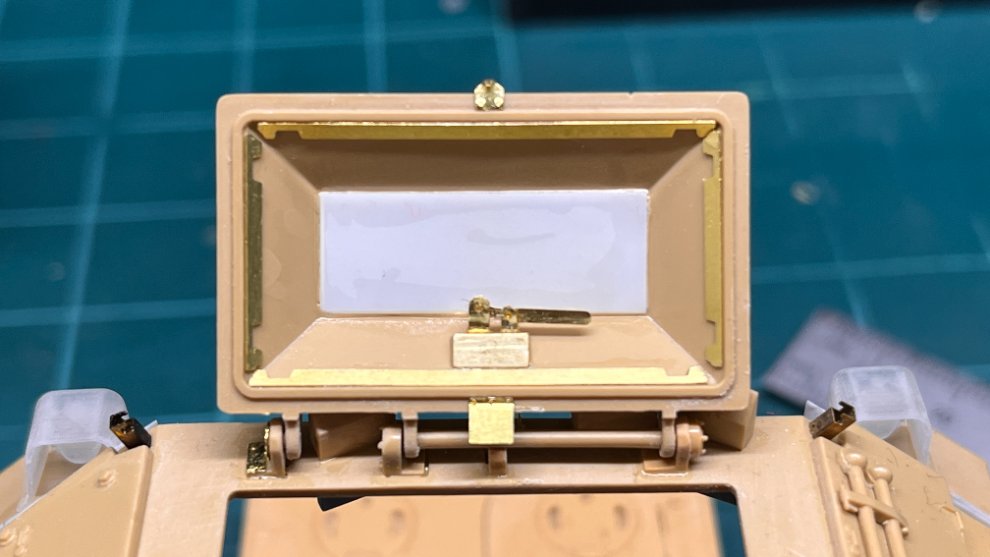 이 부품들은 안쓰고 아껴뒀다가 M2A0를 만들 때 쓰려고 했는데, 본의아니게 전차병 한명이 이 해치를 열고 밖을 내다보는 포즈가 너무 잘 어울려서 후방램프의 상부해치 안쪽 디테일업을 안해줄 수가 없었습니다. Voyager의 에칭부품이고, 해치 안쪽에는 수정이 녹록치 않은 밀핀자국이 있어서 얇은 프라판을 사이즈에 맞게 잘라서 붙이고 밀핀자국을 가렸습니다.