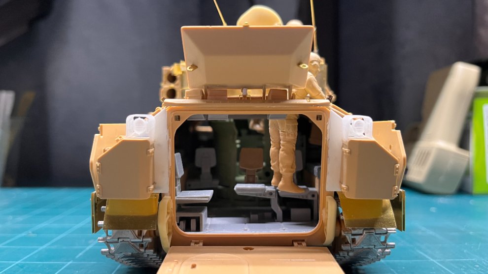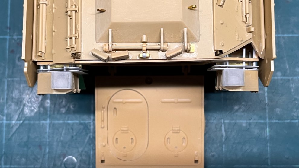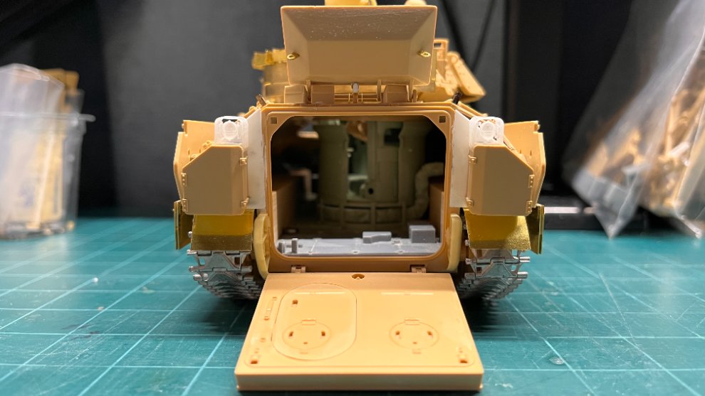 사진으로 구분이 되실지 잘 모르겠지만, 후방해치가 열리고 닫힐때 문을 붙잡아주는 걸쇠도 에칭부품으로 붙여주었습니다. 해치의 좌우 윗쪽 코너에 얇게 보이는 부품이 그것입니다. Eduard의 M3 Bradley Exterior Set에서 가져왔습니다.