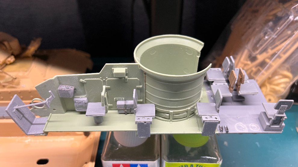 차체상부를 결합하지 않은 상태의 모습입니다. 이렇게 인테리어가 들어있는 모형을 도장할때는 보통 내부의 도장을 모두 끝낸 후, 안팎의 해치를 모두 마스킹하고 차체의 상하판을 단단히 붙여준 후에야 외장의 도장을 할 수가 있습니다. 그래서 도장하기 편리하도록 아직 인테리어부품도 하판은 아직 접착하지 않았고 좌우의 기구부들도 무수지접착제로 아주 가볍게만 접착해 둔 상태입니다. 도장과 데칼, 워싱 및 웨더링 작업이 모두 끝난 후에야 차체의 상하판을 붙여줄 수 있겠네요.