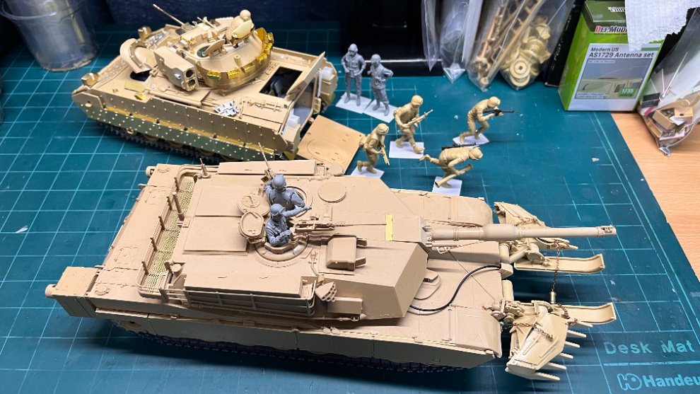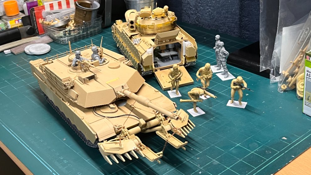 앞서 완성시킨 RFM의 M1A1 Abrams와 이렇게 저렇게 배치해보면서 디오라마에 알맞는 레이아웃을 찾고 있습니다.