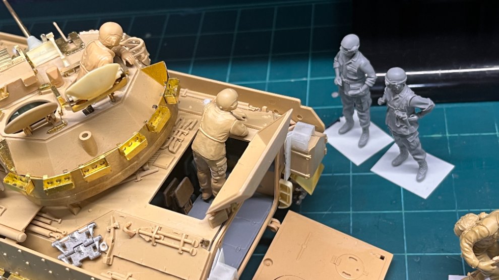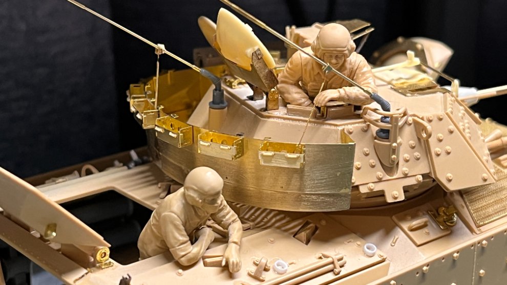 포탑의 전차장위치에 놓인 인형은 아무생각없이 놓았다가 의외로 조합이 괜찮았던 Tamiya의 M60A3에 들어있는 전차장 인형입니다. 후방램프의 상부해치에 보이는 인형은 이전의 작업기에서 주로 포탑에서 놀던(?) 인형인데, Tamiya의 M1A1 Abrams에 들어있는 포수 인형입니다. Tamiya의 Modern U.S. Accessory Set에 들어있는 전차병의 다리를 잘라서 상반신만 들어있는 이 인형에게 이식해서 전신형태의 인형을 만들어주었습니다.