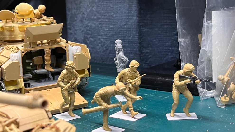 Bradley에서 뛰어나오는 보병들은 모두 Tamiya의 현용보병세트 "Desert Scheme"의 것들인데, 여기에 뛰어가는 무전병을 하나 더 추가해줄 예정입니다. "Desert Scheme"세트에 추가된 두개의 인형과 액세서리로는 Butt Bag이나 방풍고글 등 신형장비(?)를 추가해주는데 부족하여 추가로 구입하여 달아주었습니다. 이중 Butt Bag 두개는 작년 4분기에 완성한 디오라마 "Fail-Safe Line"의 인형에 멋모르고 쓰는 바람에 "Desert Scheme"세트를 하나 더 샀답니다 ㅎㅎㅎ