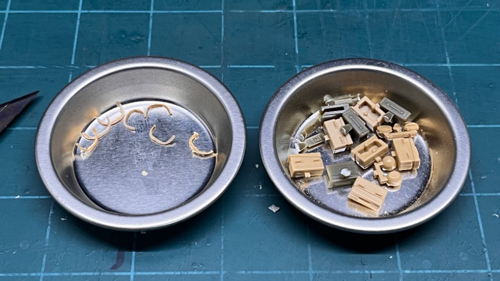 사진의 오른쪽 도료접시에는 Tamiya의 신형포탑바스켓에 붙여야하는 탄박스와 홀더가 일체형으로 된 부품들이 보이는데, 여기서 Footman Loop만 살살 잘 떼어내어 에칭부품으로 만들어놓은 포탑바스켓의 탄박스에 붙여주었습니다.