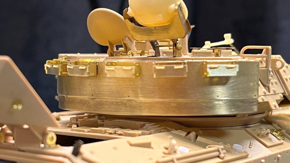 포탑바스켓의 탄박스홀더에도 프라스틱부품을 잘 붙여주었습니다. 이곳역시 Footman Loop를 붙이기 좋도록 구멍이 표시되어 있어서 위치에 맞추어 붙여주었습니다.