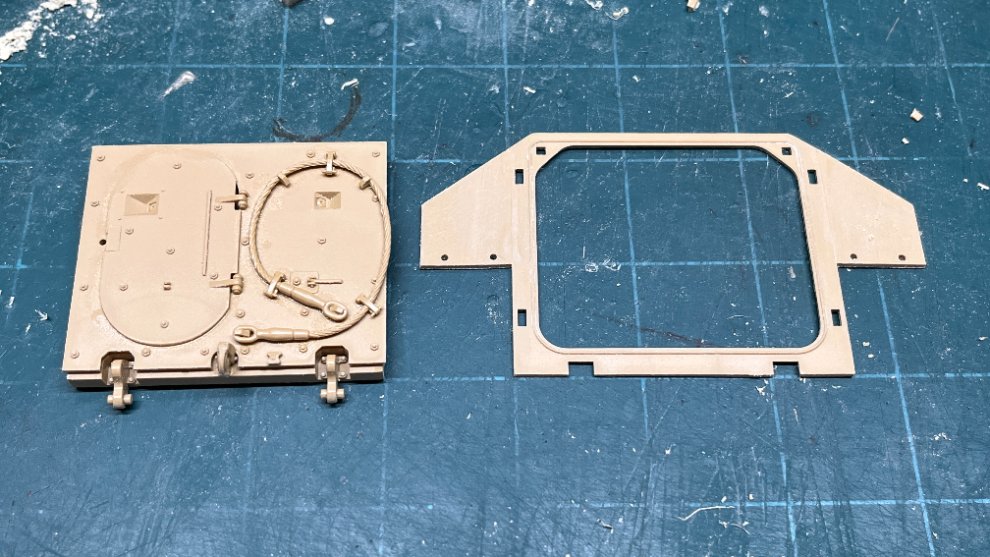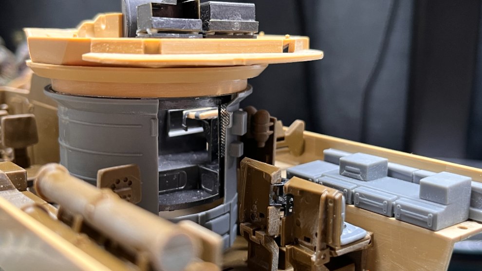 상부의 구조물까지 부착된 후의 모습은 이런 느낌입니다. 포탑 내부의 인테리어가 생략되어 포탑쪽 기구도 해치가 닫힌 형태로 구현되었던 Tamiya의 부품을 가공해서 Eduard의 포탑 인테리어가 잘 보일 수 있도록 열어주었습니다.