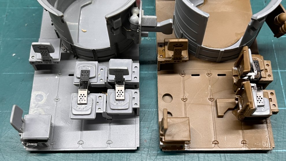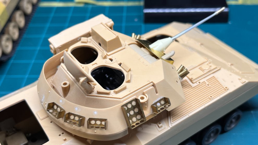 Eduard의 35131(구판)과 35584(신판)은 바스켓의 탄박스홀더의 크기가 약간 다릅니다. 처음엔 각각 한세트씩밖에 없었고 형태 자체는 35584가 더 정밀하긴 하지만, 이후에 35131이 한세트 더 생겨서 이번 디오라마에는 두대를 모두 35131용 부품으로 통일해주려고 합니다. 포탑 우측의 에칭부품은 통짜부품을 접어서 만들도록 되어있는데 안테나포스트 사이의 간격이 과하게 넓어서 에칭을 잘라내고 좀 줄여주었습니다. 붙여놓고 보니 실물의 부착위치에 비해 좀 아래로 쳐저있어서 다시 떼어서 위치에 맞게 붙여줄 예정입니다.