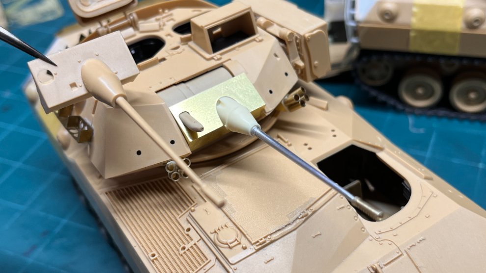 Voyager의 VBS0159 Modern US M2A2 Turret Weapon Set는 에칭제 포방패와 디테일이 정밀한 포뭉치, 그리고 느낌이 아주 좋은 발연탄발사기가 들어있습니다. 키트에는 M2A2에 사용되는 신형 M242 Bushmaster가 들어있기 때문에 구형 기관포를 구현하기 위해 RB Model의 제품을 포뭉치를 가공하여 붙여주었습니다. 이후에 Voyager의 M2A2 디테일업세트에 들어있는 에칭과 황동선 부품을 가공해서 기관포의 조준기를 만들어주려고 합니다.