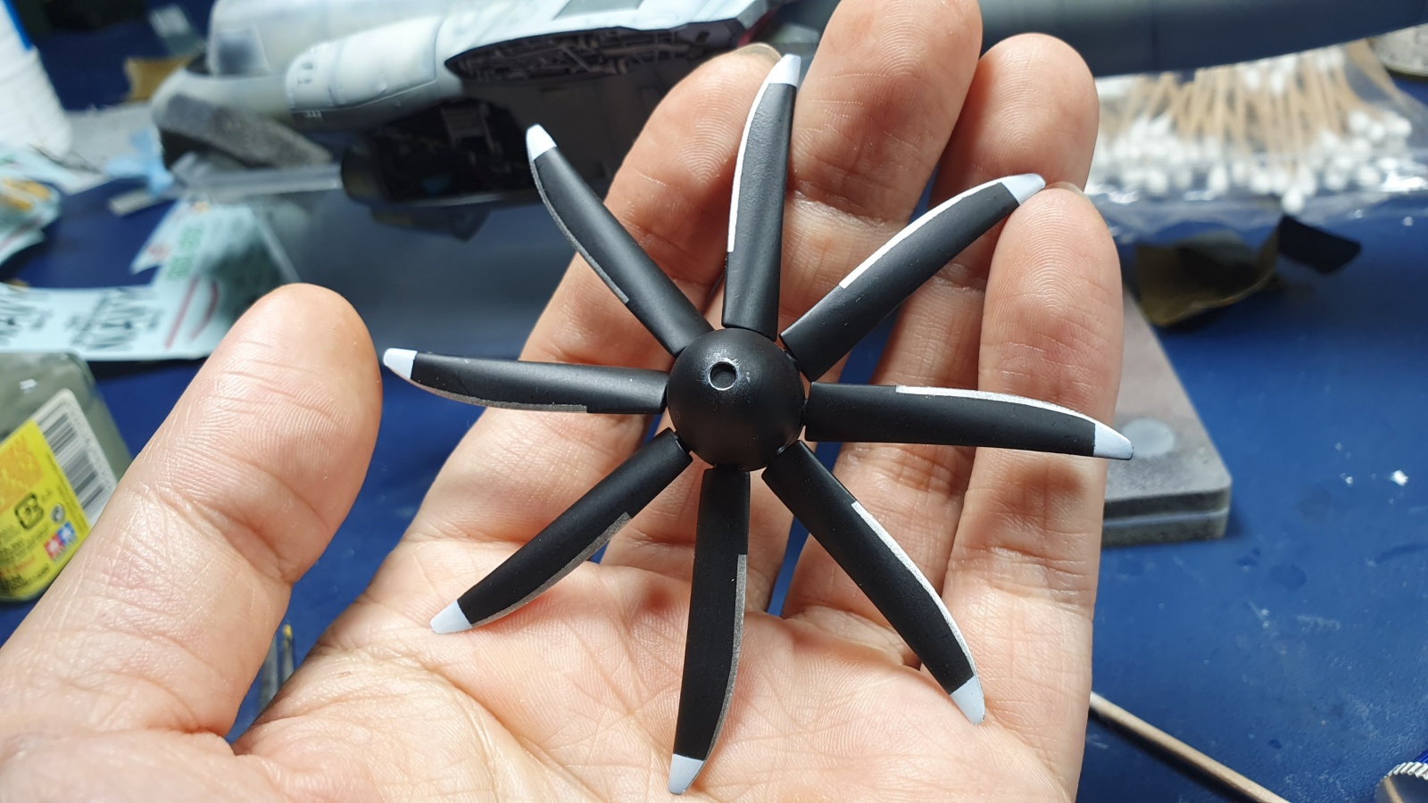 프로펠러는 엣지 부분이 양각몰드로 몰드되어 있는데 몰드가 매우 두껍고 모양도 엉터리라 밀어내고 다시 마스킹 해줘서 칠해줬습니다 프로펠러날이 모두 16개라 32군데 마스킹 하느라 시간이 엄청 걸렸네요.