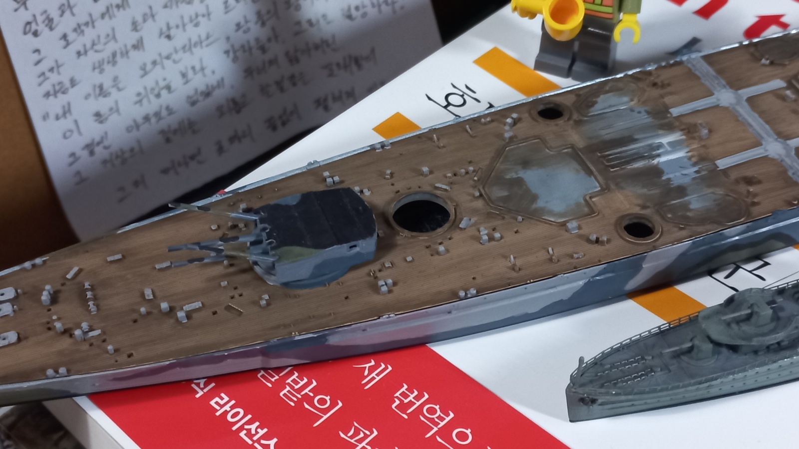 휴대폰 카메라로 찍으니 크게 티가 안나는데 우든 덱 탄으로 칠하고 패널라인 악센트 다크 브라운을 평붓에 뭍혀서 전체적으로 덮어버리고 신너로 슥슥 붓끝을 이용해 정리했습니다. 손가락 한마디 정도로 드라이브러싱 하듯이 마지막에 마무리했는데 이거... 지금 생각해보니 갑판이 너무 어두운건 아닌가 싶습니다.