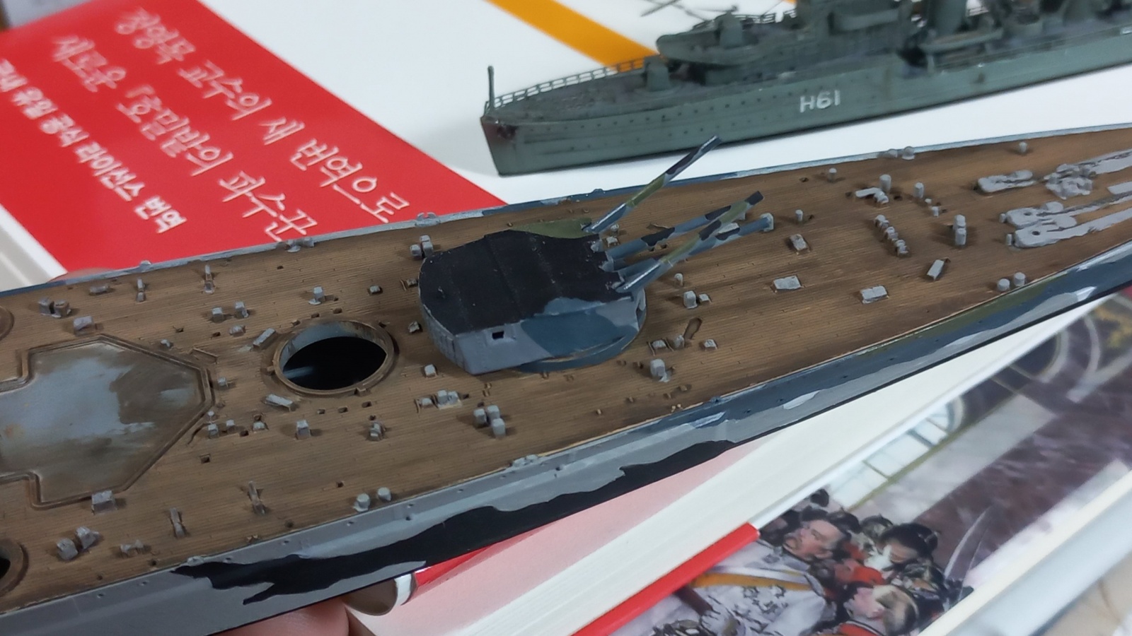 이렇게보니 비록 유화를 썼지만 면봉으로 닦아주면서 너무 닦아냄 + 갑판 테두리 구조물에 면봉이 걸려서 정작 테두리는 밝은색이라 어색한 후드보다 프린스 오브 웨일스가 더 좋긴 하네요.