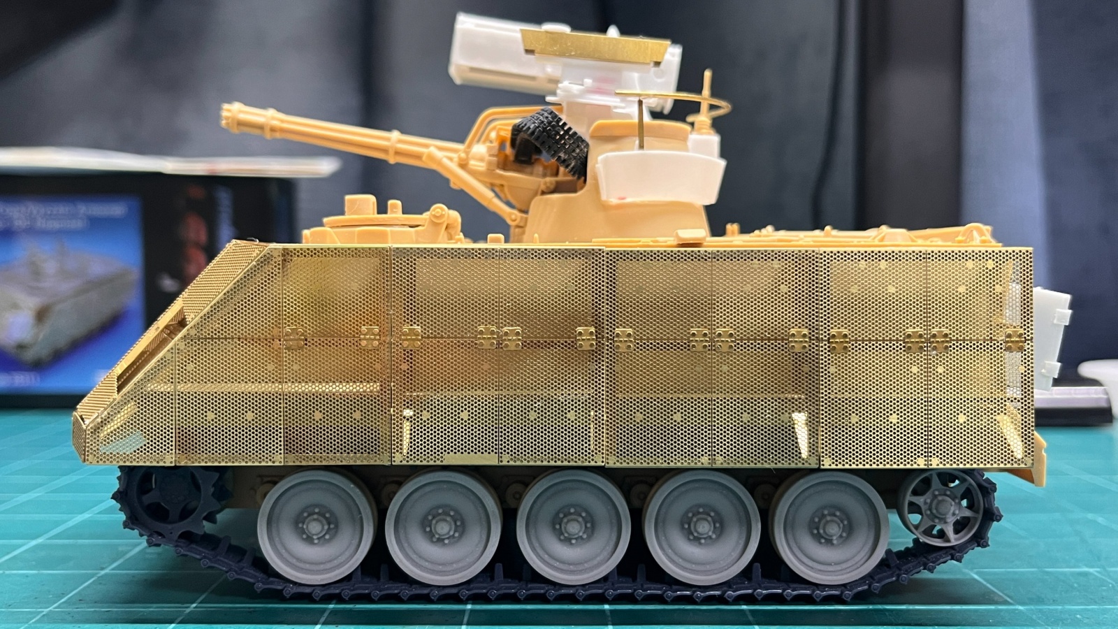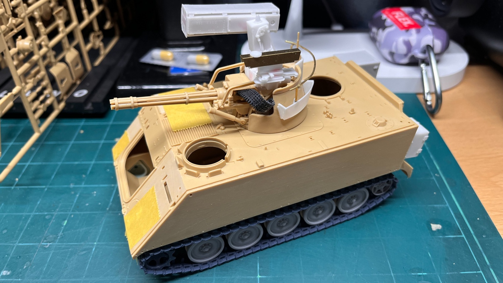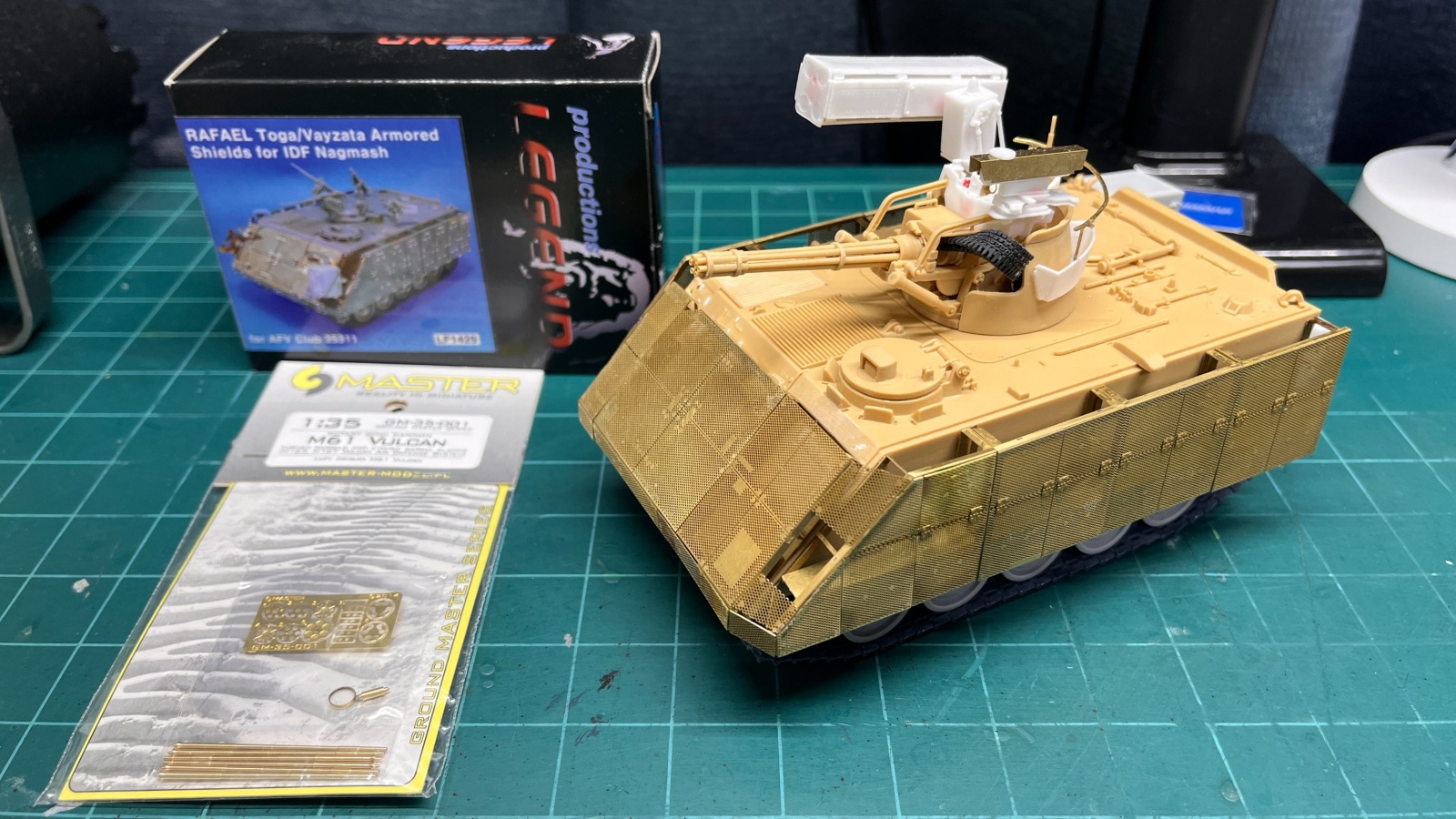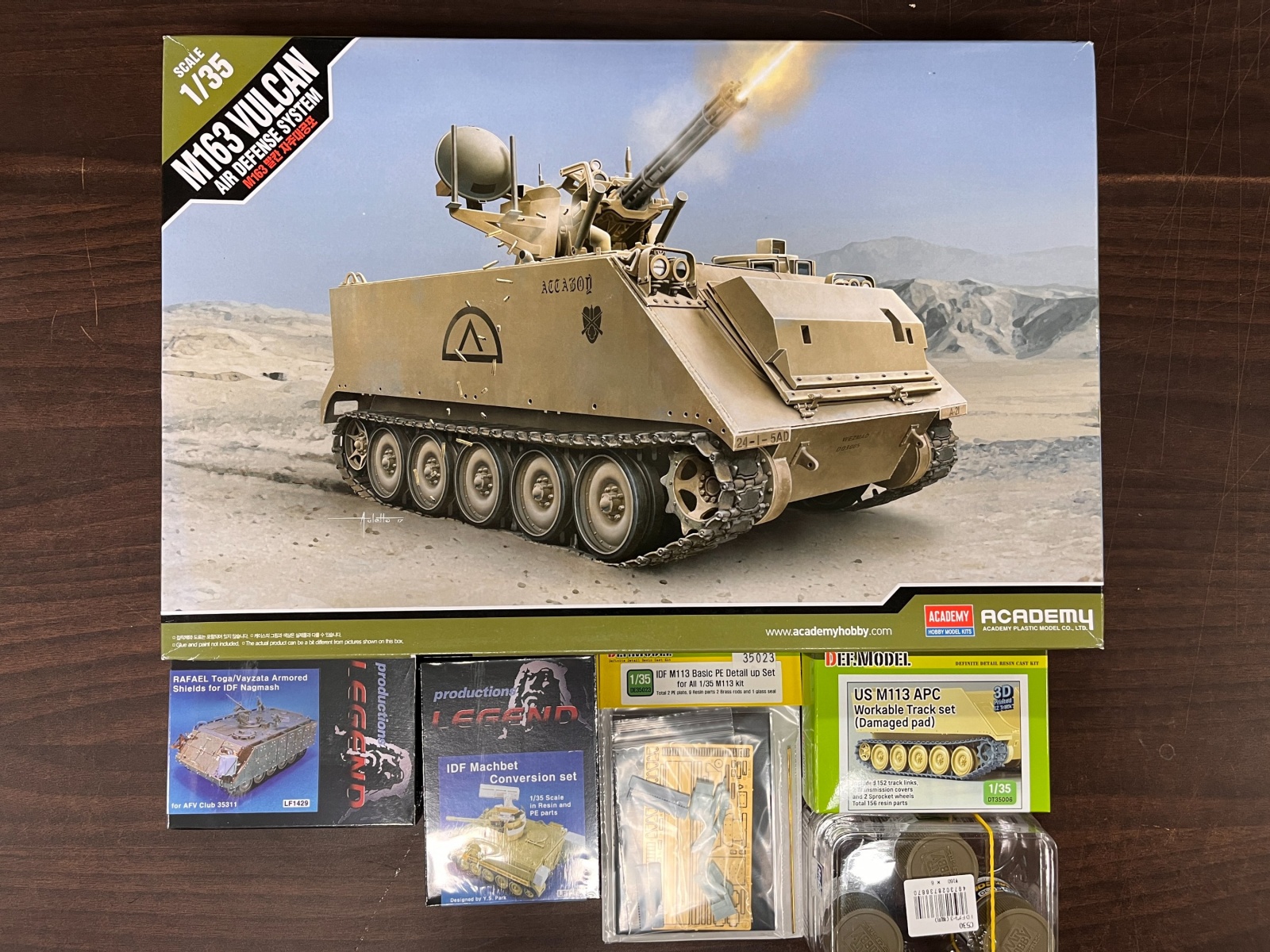 베이스 키트는 아카데미과학의 M163 VADS(Vulcan Air Defense System)을 사용하였습니다. 1970년대 후반에 이스라엘에서 이 사양 그대로 들여와서 사용한 것을 Hovet이라고 하였습니다. 이스라엘에서는 90년대 중반에 여기에 FIM-92 Stinger 공대지 미사일을 추가하여 Machbet이라고 이름을 붙여서 사용하기 시작했습니다. 생각하고 있는 형태로 만들어주기 위해서 DEF Model의 IDF M113용 디테일업세트, 3D프린팅제 궤도, Legend Production의 Machbet Conversion Set, Toga Armored Shield Set를 구입하였습니다.