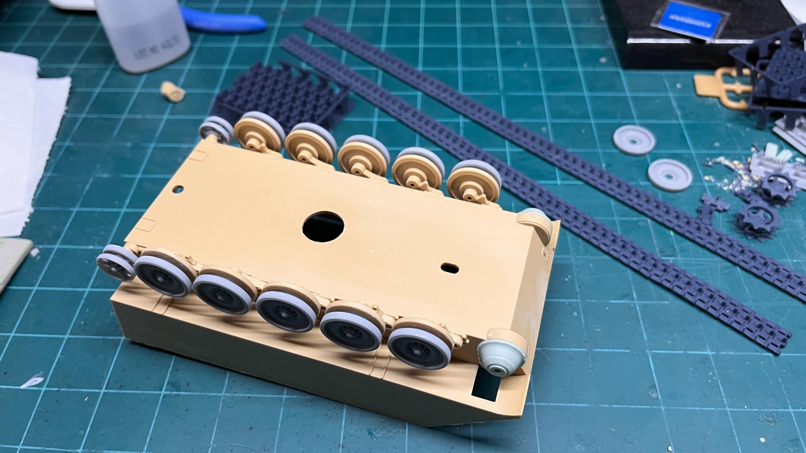 토션바의 간격이 잘 맞기 위해 조립한 로드휠들을 모두 토션바 부품에 끼워넣은 후 수지접착제를 써서 차체에 접착하고 바닥에 놓아서 정렬을 가지런히 맞춰주었습니다. 특히 궤도의 센터가이드티가 잘 맞도록 일자로 펴놓은 트랙 위에 올려서 수지접착제가 잘 마르도록 해주었습니다.