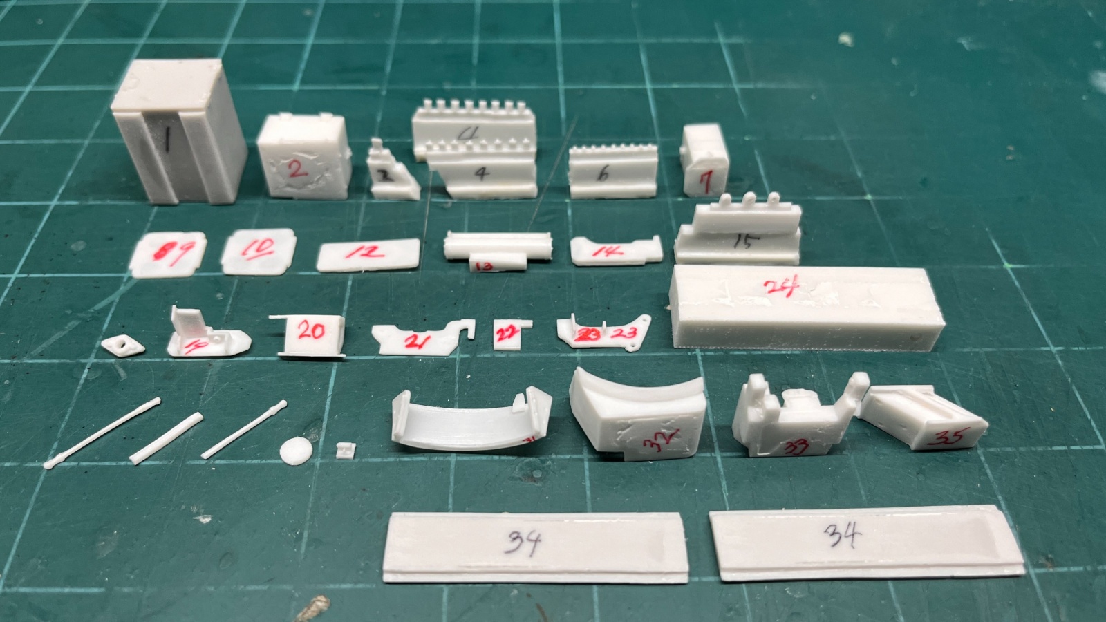 각 레진부품의 게이트에는 유성펜으로 부품의 번호를 써놓는 편인데, 좀 지루한 작업이기는 하지만 게이트를 모두 제거하고 접착면 등 외부로 드러나지 않는 곳에 다시 부품의 번호를 써놓았습니다. 구입한 제품의 레진성형색상이 흰색이어서 모양이 잘 보이지 않다보니 부품끼리 헷갈리면 안되겠더라구요.