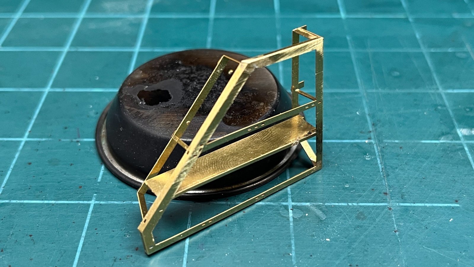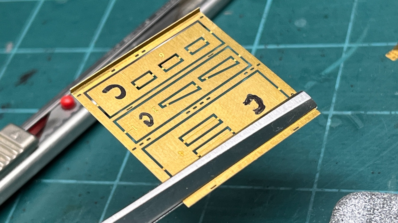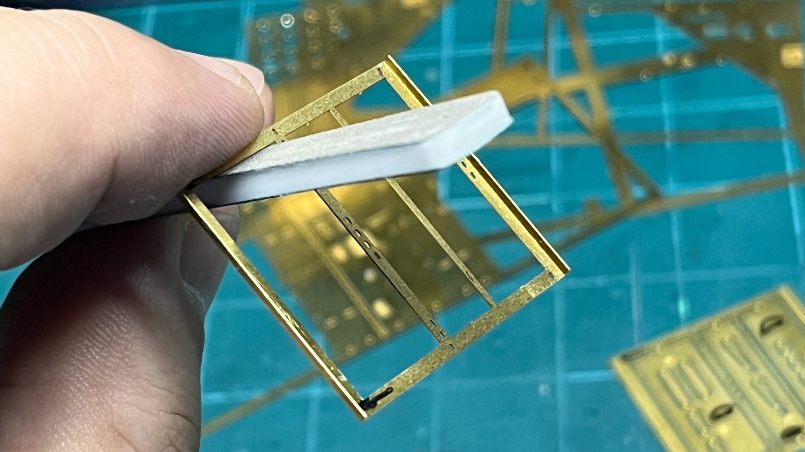 프레임부품들은 제품의 설계시 에칭부품의 공간절약차원 등등의 이유로 세세한 부품들이 그 속에 별도의 공간을 차지하고 있습니다. 이런 경우에는 미리 저 부품들과 여백의 황동판을 들어내봐야 프레임의 전체를 다듬을 때 휘어버리기 딱 좋으므로 부품을 들어내기 전에 미리 프레임의 바깥 부분을 잘 접어주고 미리 사포스틱으로 게이트의 거스러미를 모두 다듬어 준 후에 내부 부품들을 들어내고 다듬는 방법으로 진행하였습니다.