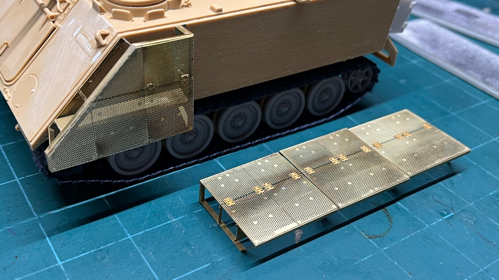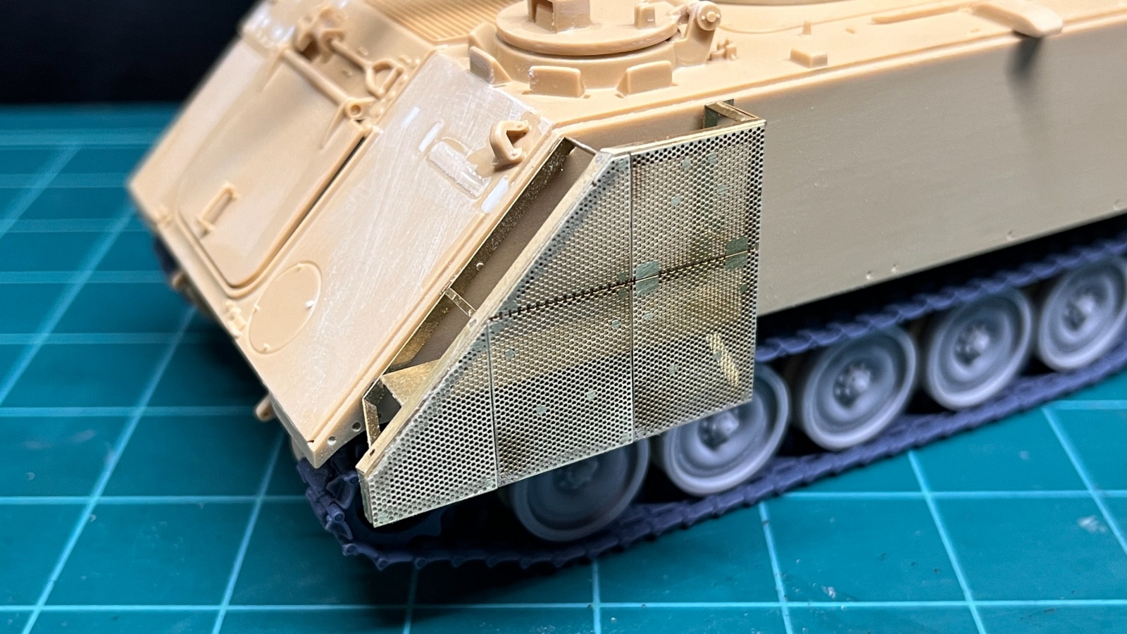 특히 좌우측 측면의 첫번째 장갑모듈같은 경우는 전면장갑과도 연결되는 부위이기 때문에 차체의 형상에 잘 맞춰서 에칭부품을 붙여주는 것이 좋겠습니다. 처음엔 Legend Production의 제품이 AFV Club용으로 발매되어서 아카데미과학의 M113과 전면장갑의 각도에 차이가 있으면 어쩌나 걱정했는데, 눈으로는 구분하기 어려울정도로 장갑의 각도는 같았습니다.