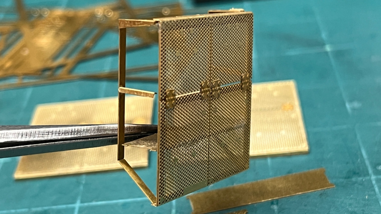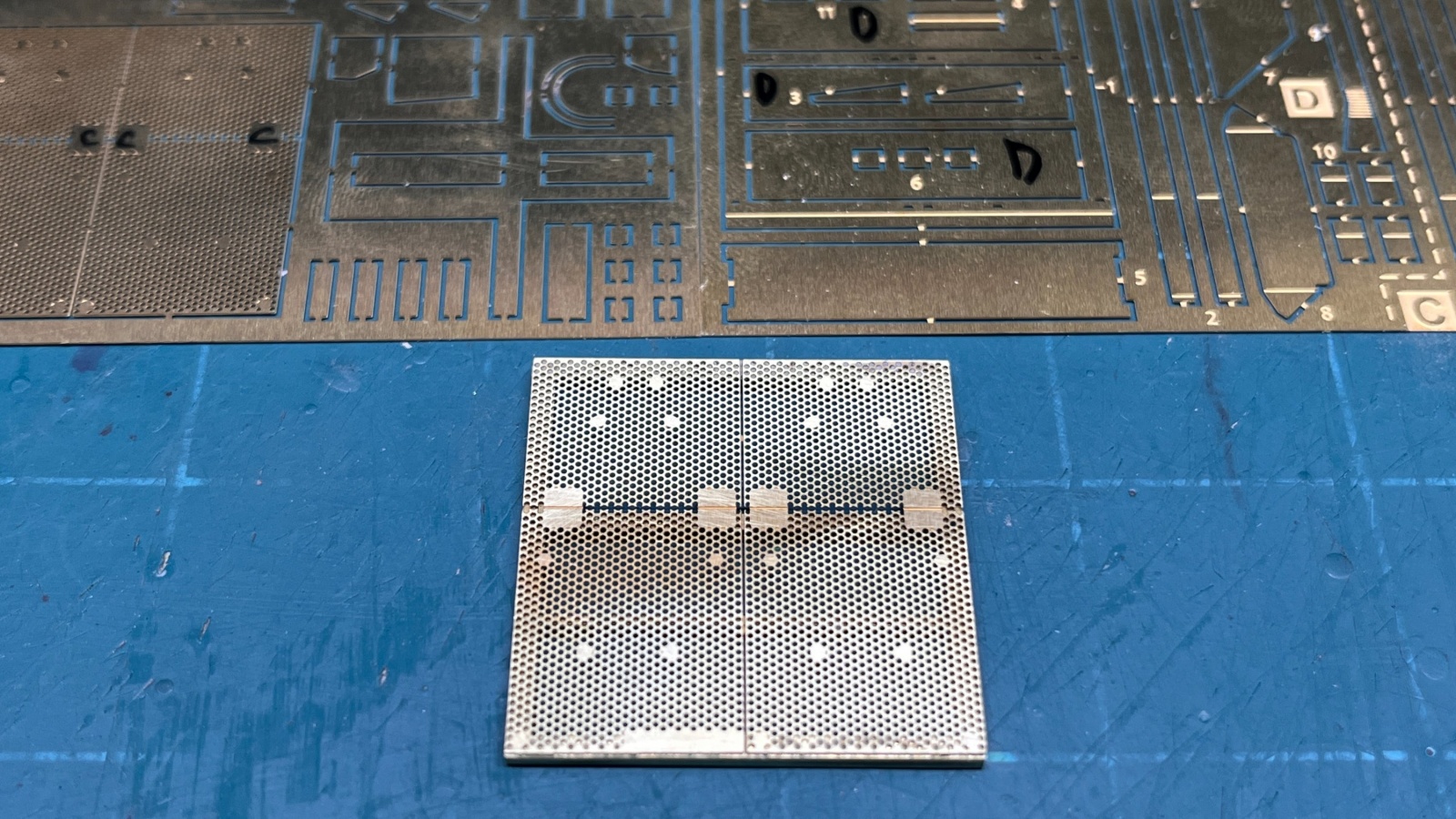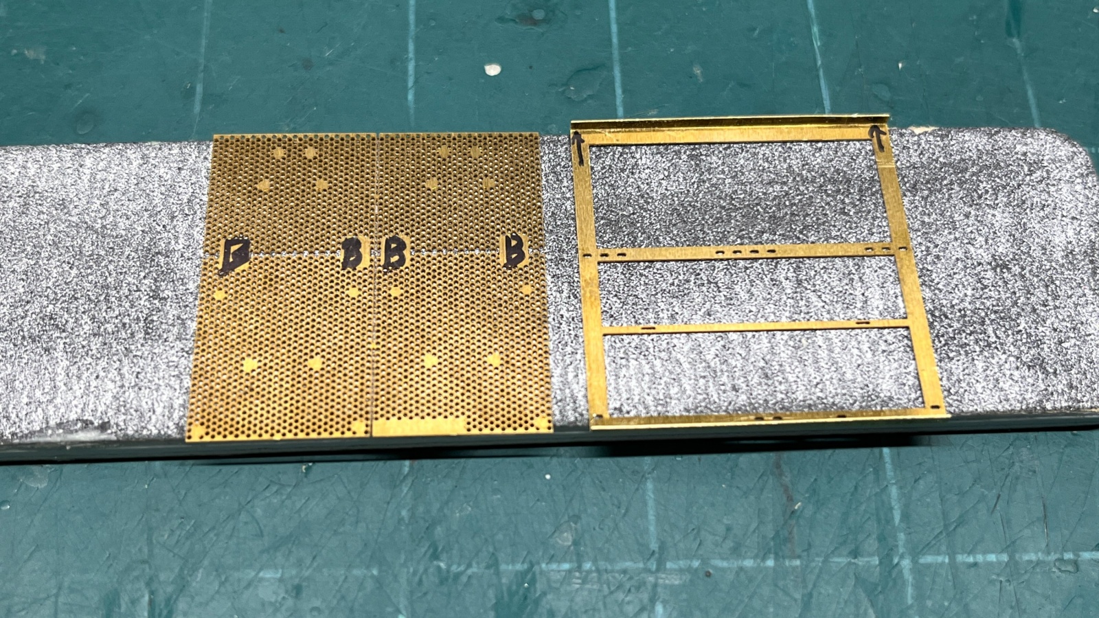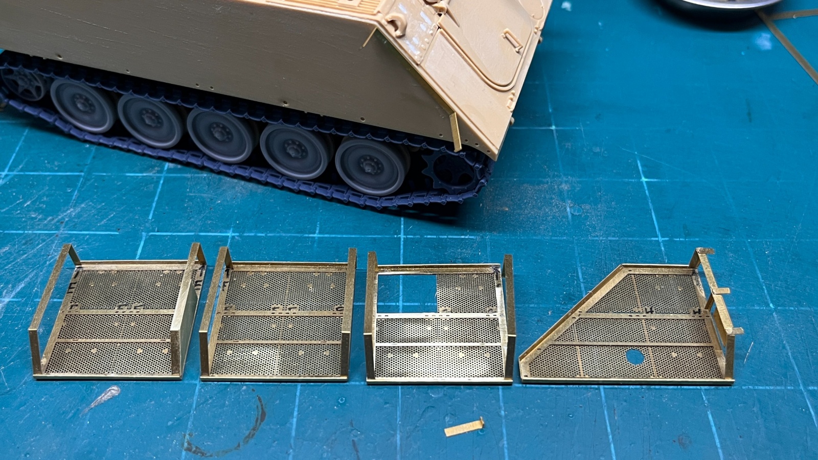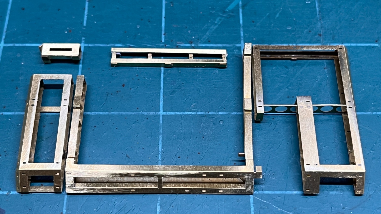 Legend Production의 제품은 3D 프로그램을 사용해서 설계한만큼 큰 믿음이 갔지만, 아마도 에칭판의 두께나 절곡에서 발생하는 공차까지는 계산이 덜 된 것도 같습니다. 조립을 하다보니 정확히 각도지정이 되어있지 않은 프레임의 하단부와 상단부의 길이가 미세하게 달라서 타공판이 붙어있는 프레임과 차체에 붙는 프레임들을 조립해보면 상단부에 약간의 여백이 있어서 단단하게 붙는 느낌은 아니었습니다. 측면에 각각 네개, 전면에 3개의 모듈을 붙여주는 구조이므로 나중에 모두 차체에 접착할때 균일하게 붙을 수 있도록 측면에 붙이는 프레임은 한쪽만 붙여놓고 이후에 차체에 붙일때는 가지런히 붙을 수 있도록 해두었습니다.