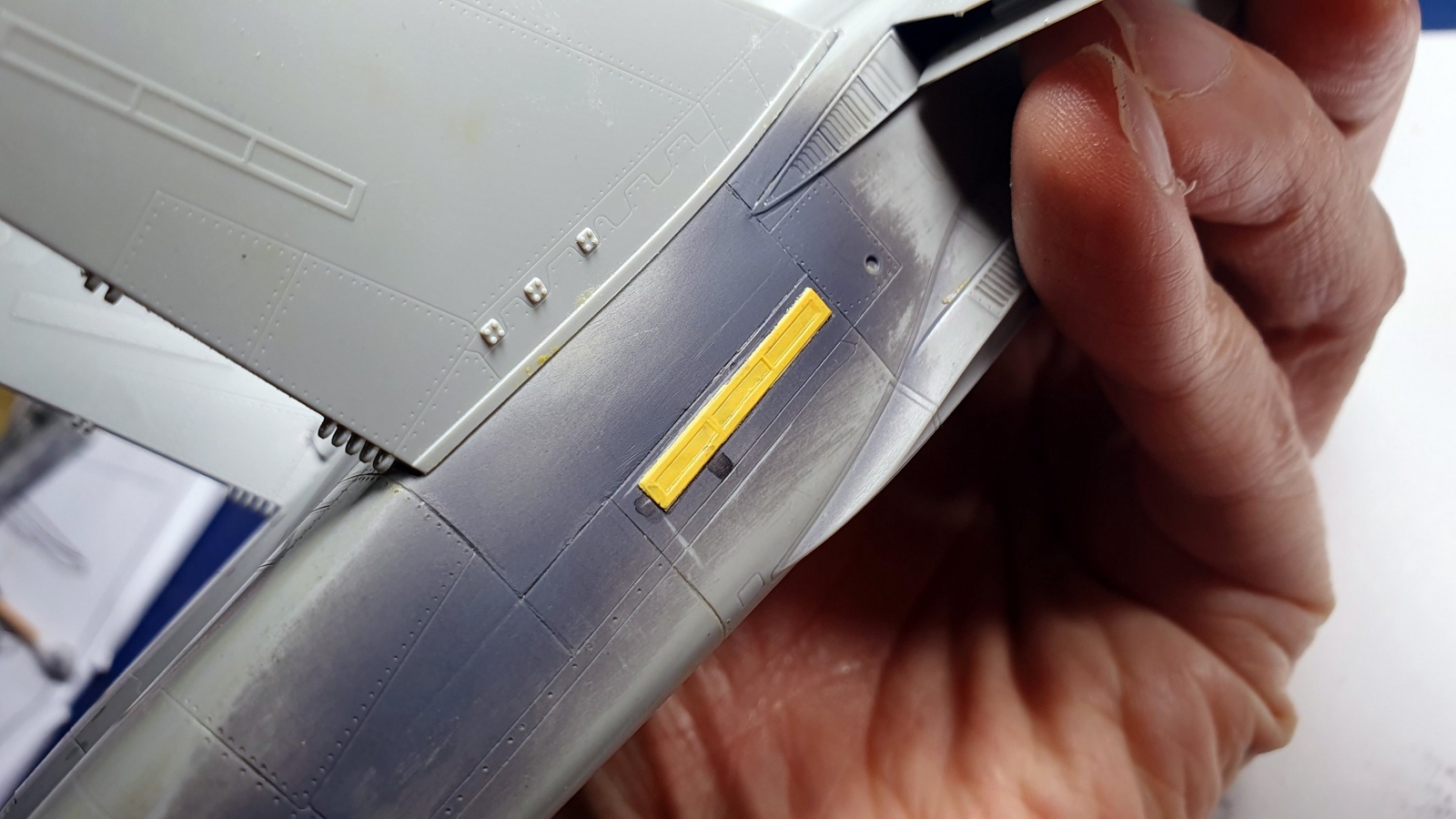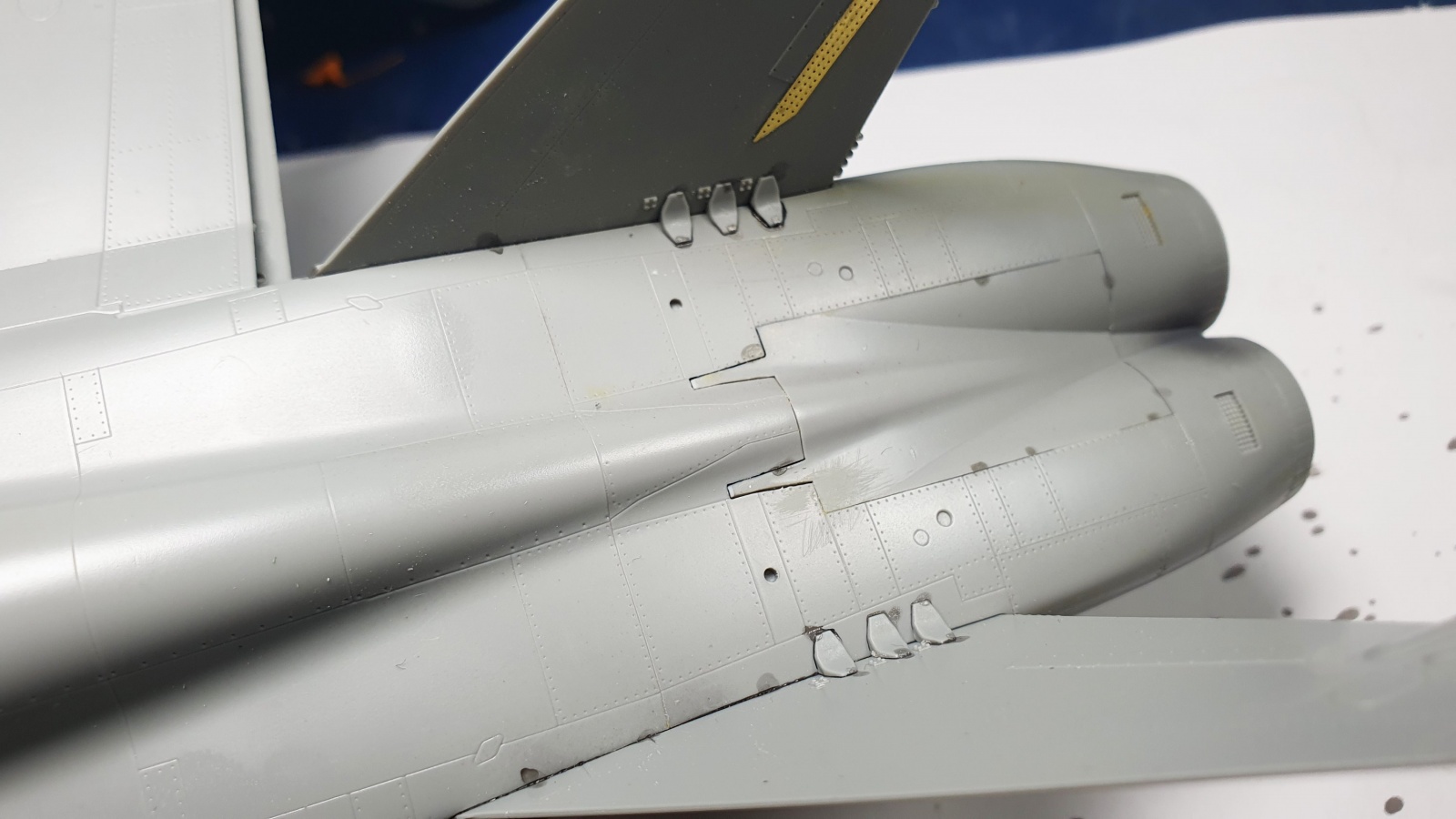 동체 후방의 저명도 편대등은 몰드도 약하고 저곳이 사포질을 많이 해야하는 부분이라 아예 밀어내고 수직미익의 편대등 몰드를 오유마루로 복제해서 붙여줬습니다, 폴리에스터퍼티가 트러블을 일으켜 엄청 고생했네요