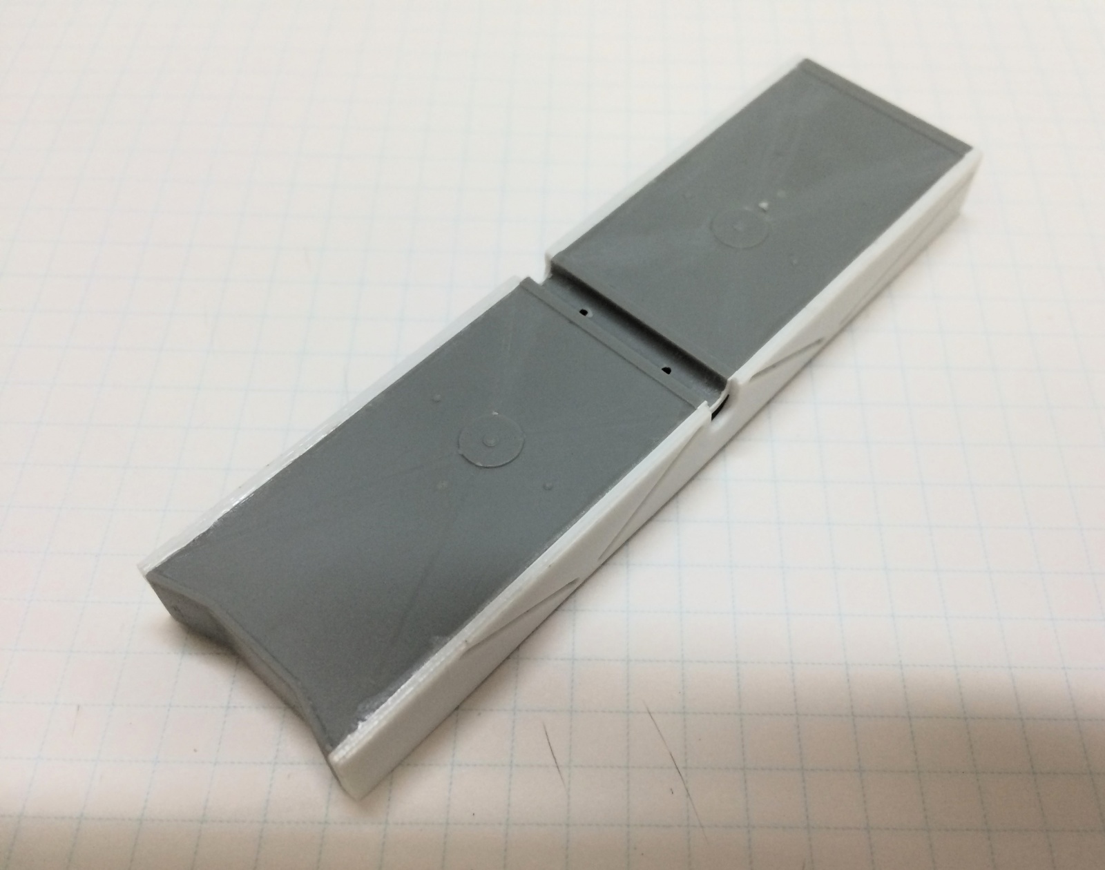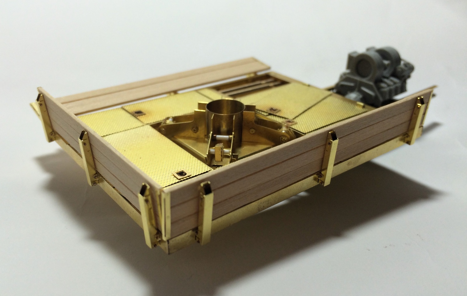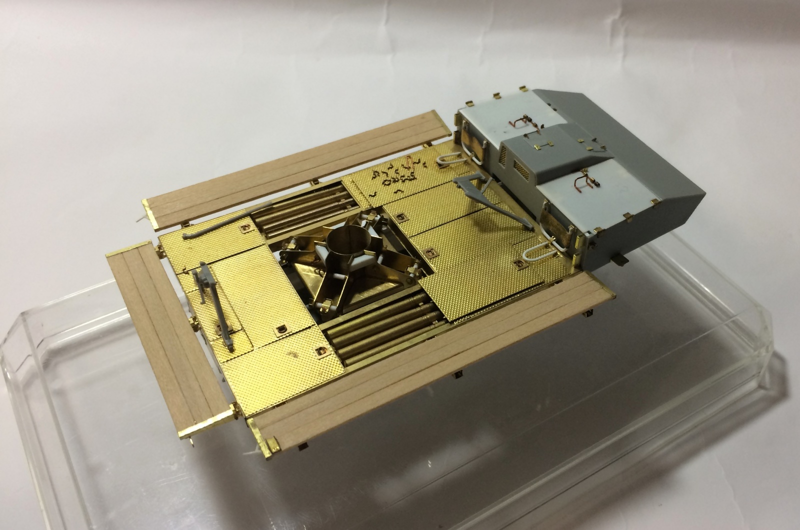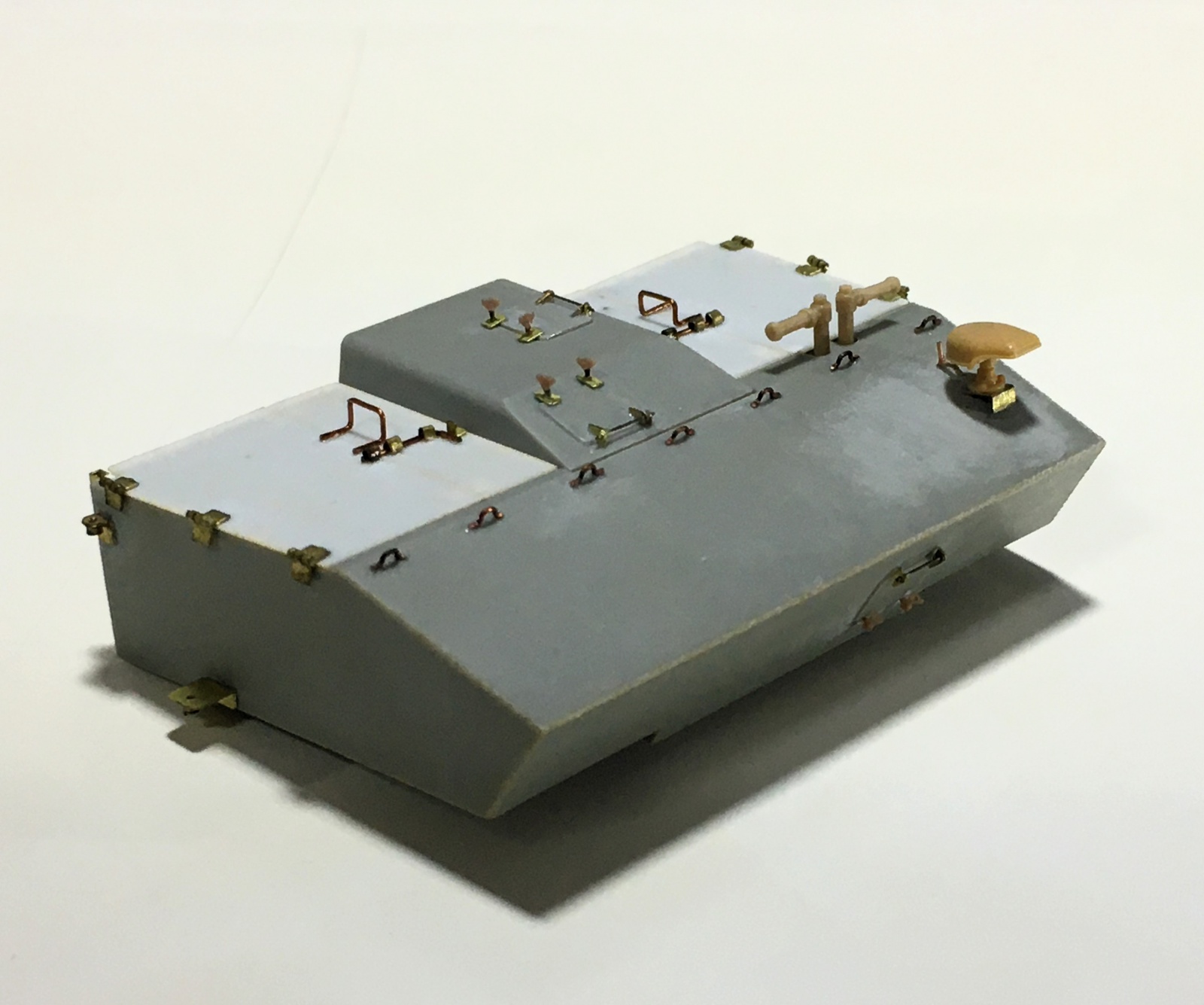 1mm 프라판 2개와 0.5mm 프라판 1개를 겹쳐서 측면을 구성하였는데, 1개의 1mm 프라판에만 ㅅ자 형태를 파내서 프레싱을 표현하는 형태로 제작하고, 상부의 철판이 접힌 부분은 0.2mm 프라페이퍼로 접합한 후 접합부위를 샌딩 처리해서 철판이 부드럽게 접힌 느낌이 나도록 해주었습니다. 대신 내측면의 디테일은 보이지 않는 부분이라 생략했습니다.