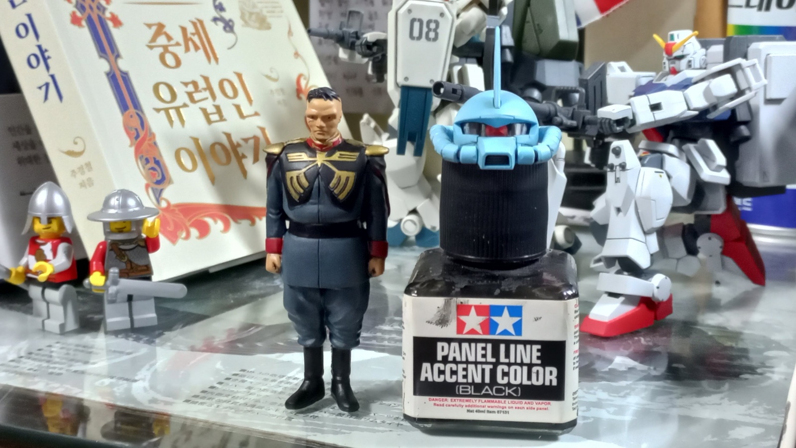 구프 커스텀의 모노아이는 이번에 천원짜리 비즈 스티커를 사용했는데요, 정말 효과가 좋더군요. 진작에 쓸 걸 많이 후회스럽습니다... ㅋㅋ 노리스 팩커드는 간단하게 타미야 아크릴 붓으로 칠했습니다. 망토와 군화, 벨트는 검정, 머리카락은 원래 고무를 칠할때 쓰는 러버 블랙, 피부는 살구색, 금장은 금색, 소매와 목의 깃, 망토 안쪽은 무광 빨강... 1/20처럼 대형 피규어는 처음인데 재밌는것 같습니다. 저도 이제라도 좋으니 피규어 도색도 천천히 배워보고 싶네요. 그랬으면 더 좋았을텐데...