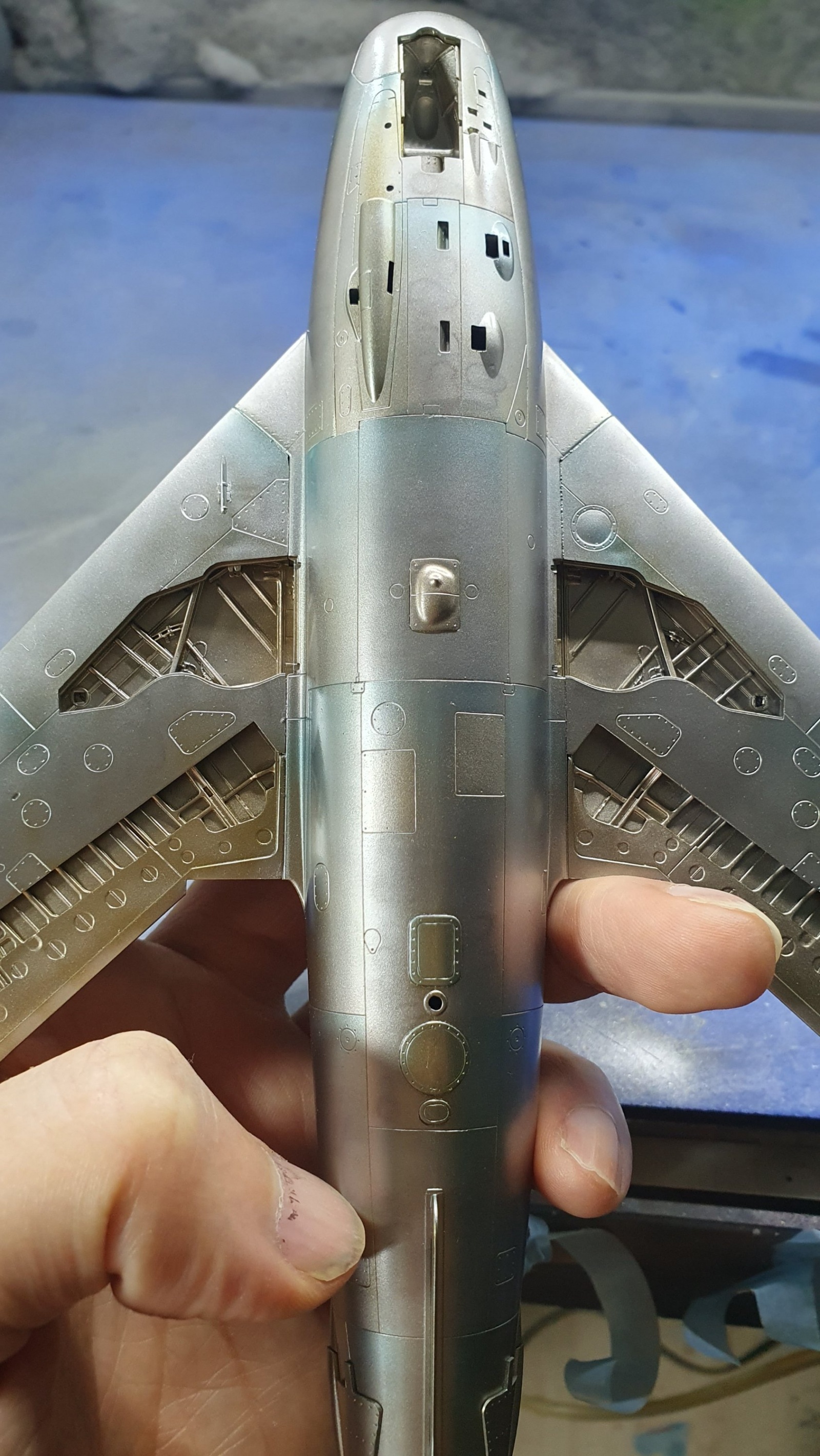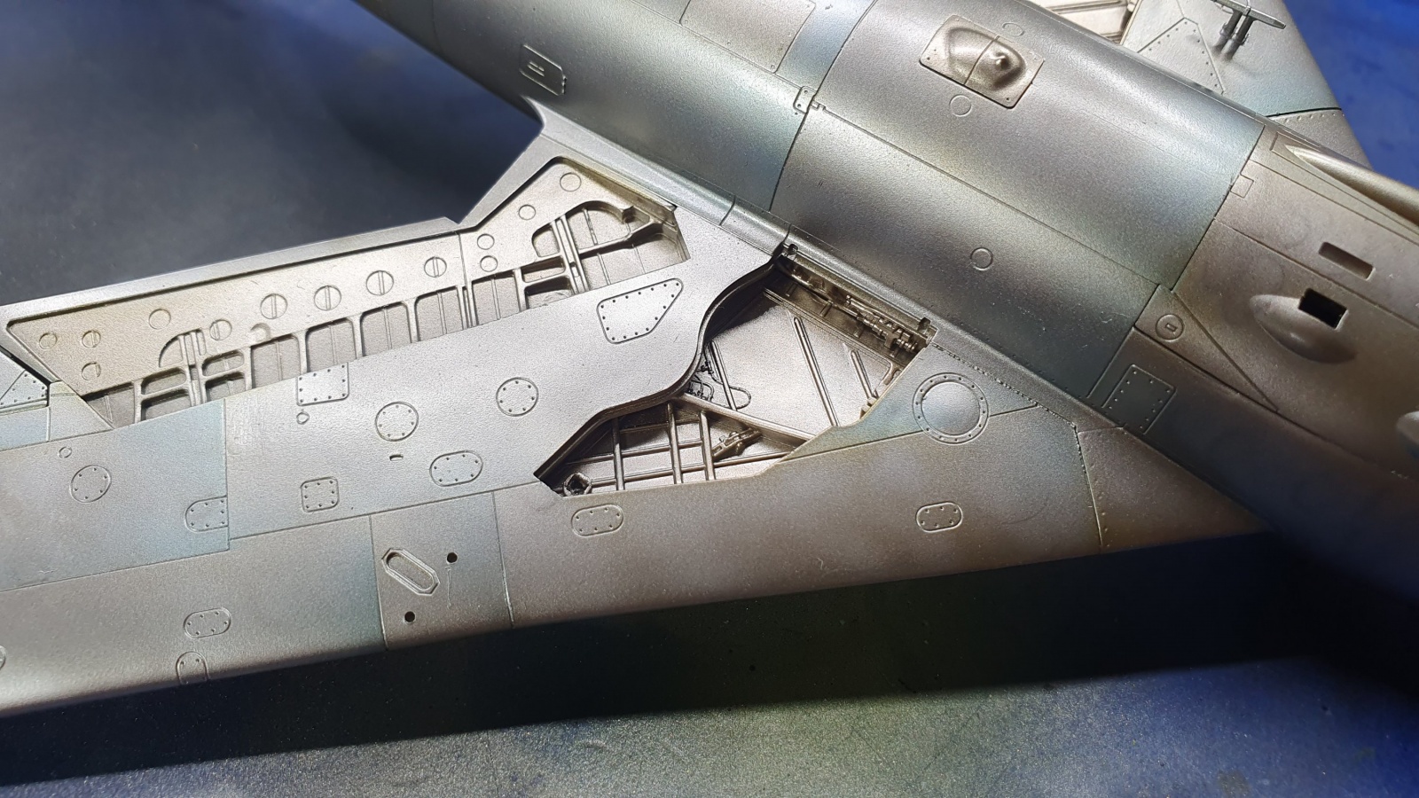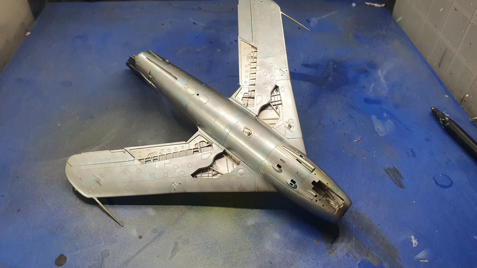 알제리 공군의 mig-17작업을 계속하고 있습니다, 상면 회색, 하면은 도장되지 않은 금속색 그대로인데 정말 특이한 색 조합이라 도색을 끝냈을 때 어떤 느낌인지 아직도 감이 잘 오지 않네요, 몇가지 메탈특색들과 클리어 컬러로 단조로움을 피해보려고 했습니다.