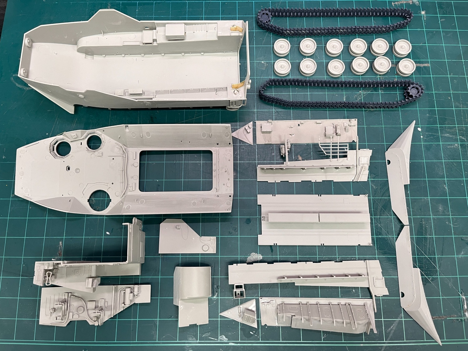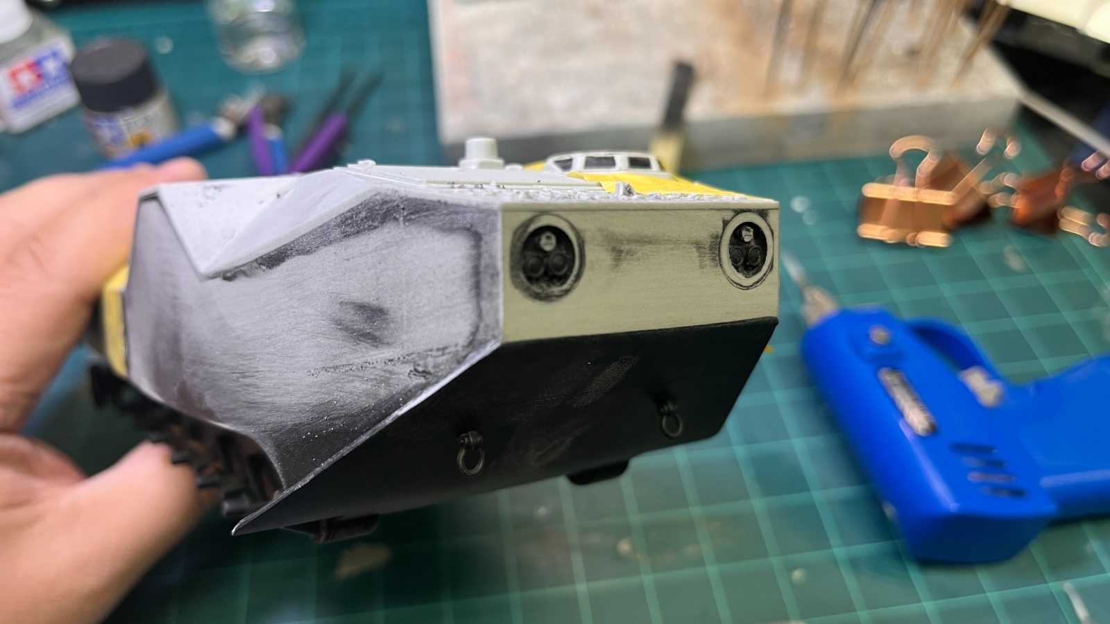 DEF Model의 궤도를 잘 결합해주고 나서야 비로소 차체앞의 장갑부품을 붙여줄 수 있네요.