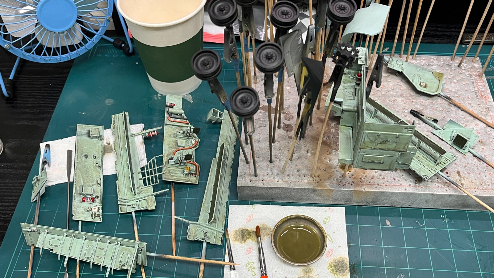 데칼까지 붙인 후 무광클리어를 칠해놓은 부품들에 AK의 인테리어그린에 맞는 워싱용액을 써서 가볍게 워싱해주고 조금 도료가 마른 뒤에 지오포일에 뭍힌 평붓으로 잘 쓸어내서 요철의 표현을 잘 살려주었습니다. AK의 도료는 Tamiya의 에나멜 가격을 생각하면 단지(?) 조색을 잘했다는 부가가치만으로 가격이 두어배 비싼데, 사실 Tamiya 에나멜의 XF-62 Olive Drab과 느낌이 비슷해서 다음엔 Tamiya 에나멜을 써볼까 합니다.