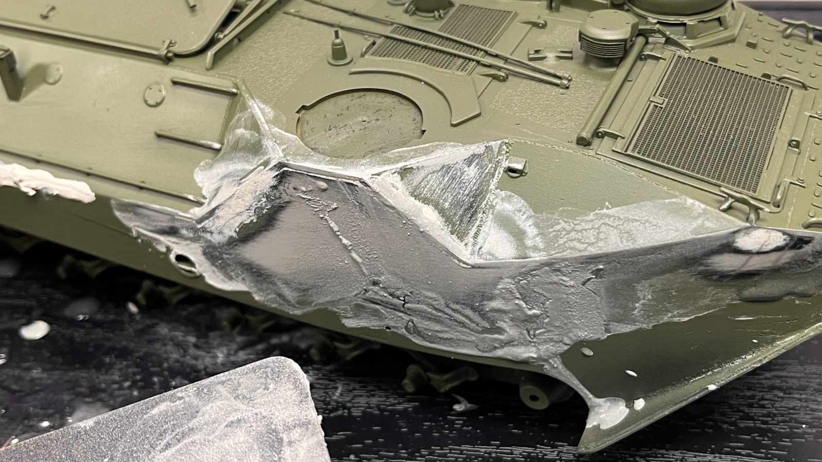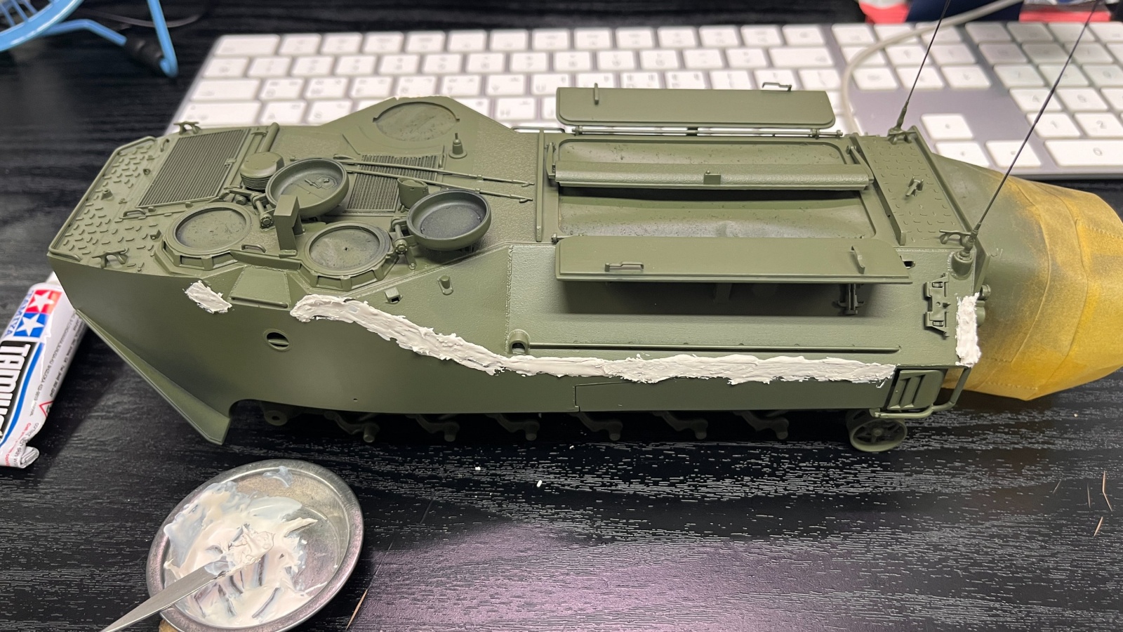 외부에도 블랙서페이서를 뿌려주고 IPP의 K-Green을 칠해놓고보니 블랙서페이서를 올렸을때는 잘 몰랐던 틈새가 보여서 다시 락카퍼티를 발라주었습니다.