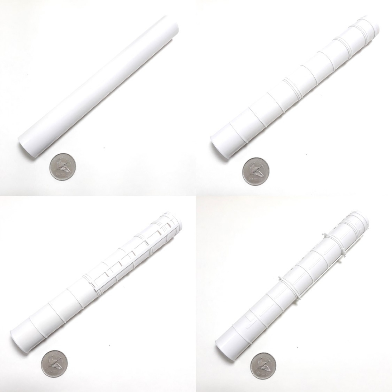 발사관 부분은 인터넷에서 쉽게 구할 수 있는 PVC 파이프로 제작했습니다. 다행히도 치수가 비슷한 것이 있었습니다. 테두리 부분은 얇은 프라판과 각재들을 잘라서 붙였습니다.