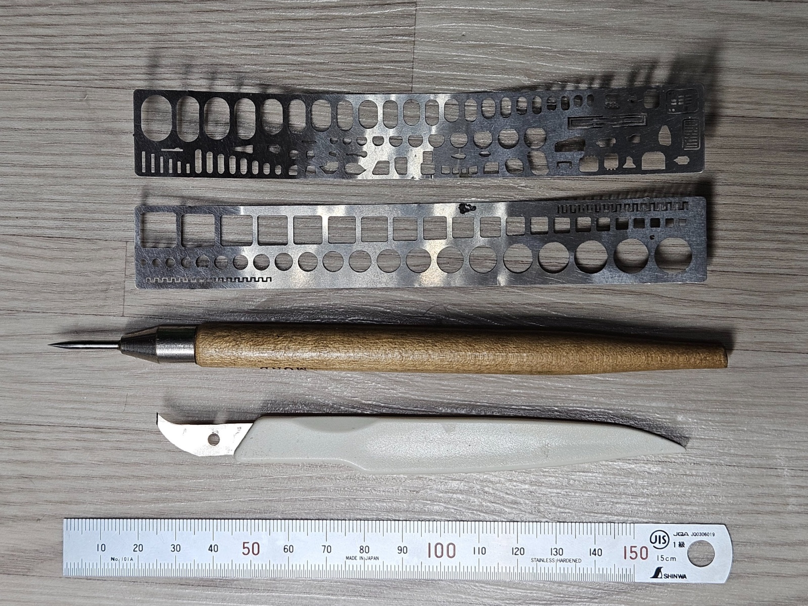 작업에 필요한 공구로 철자와 하세가와 P커터, 미술용 철필, 벨린덴 사제 템플레이트로 작업 했습니다.