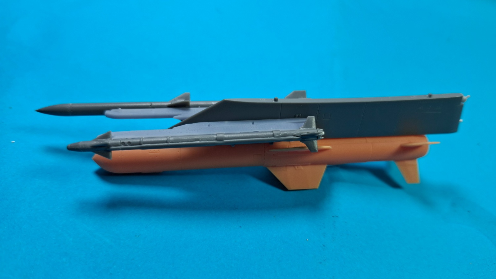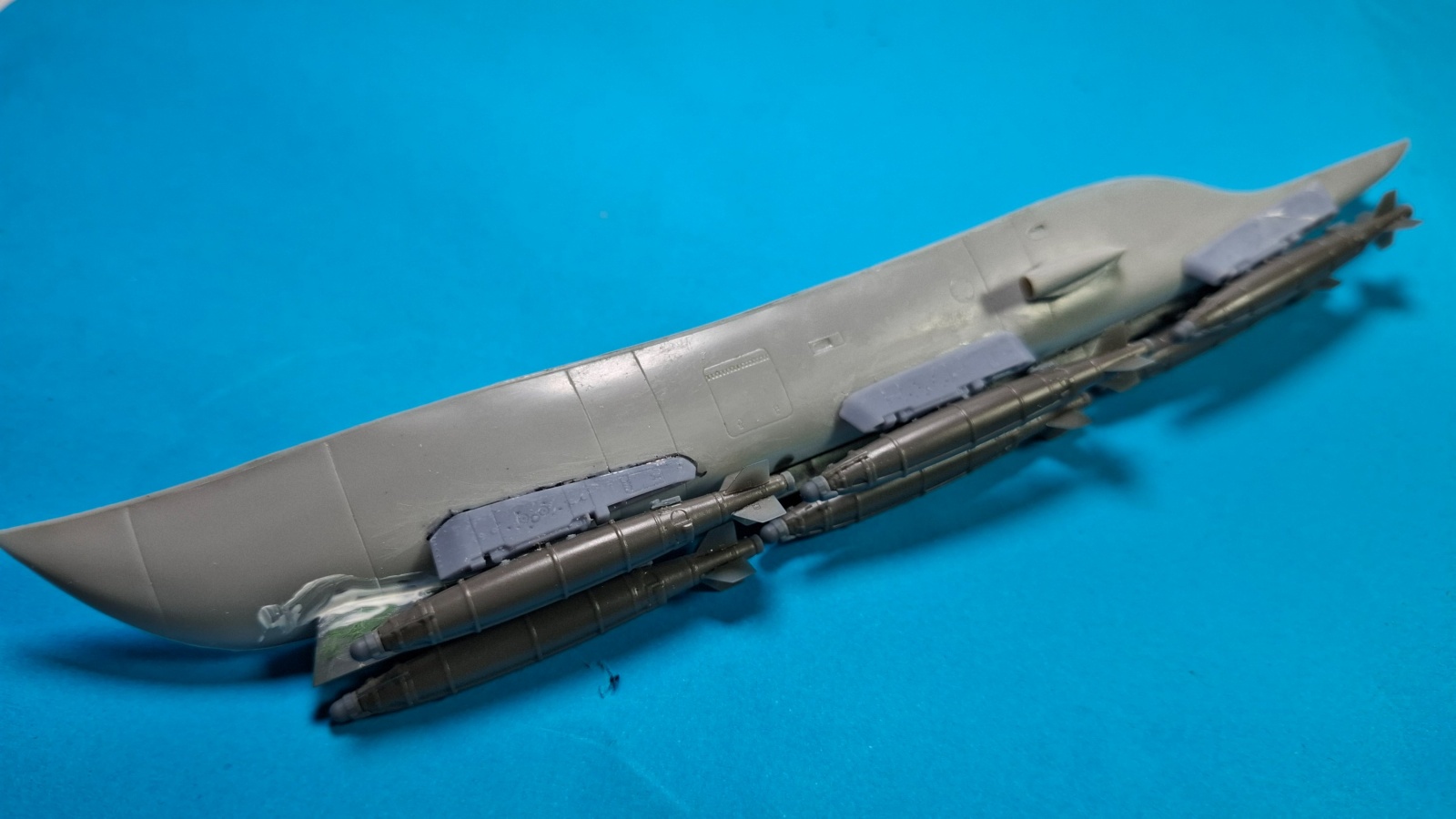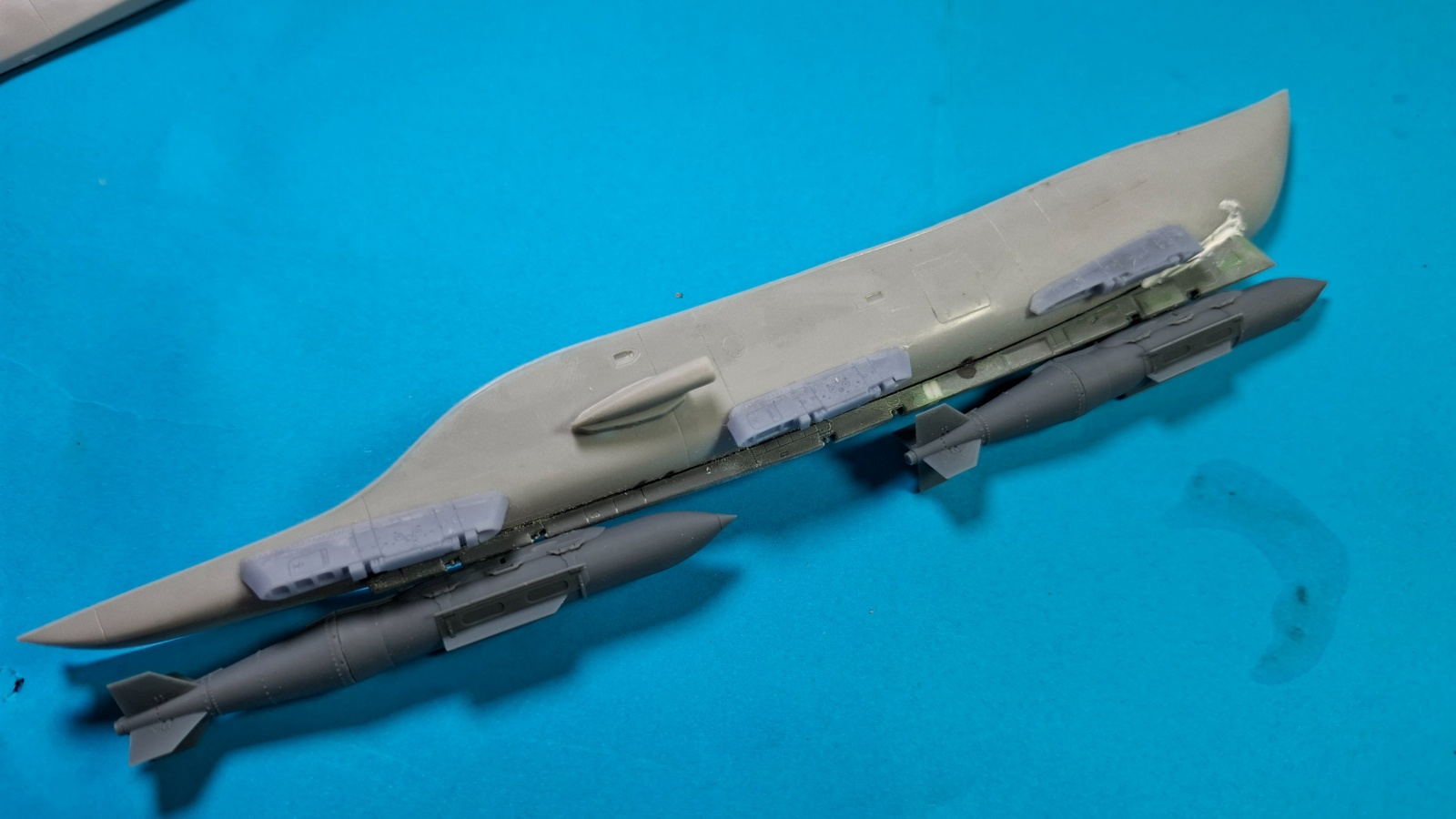 아카데미도 마찬가지로 폭탄 3발을 마운팅 할 수 없는데 그래도 스웨이 브레이스 간격은 일정합니다 3발 마운팅이 안돼는 이유는 파일런의 길이가 전체적으로 짧기 때문인데 중간을 잘라서 프라판을 적층하여 길이를 연장했습니다.