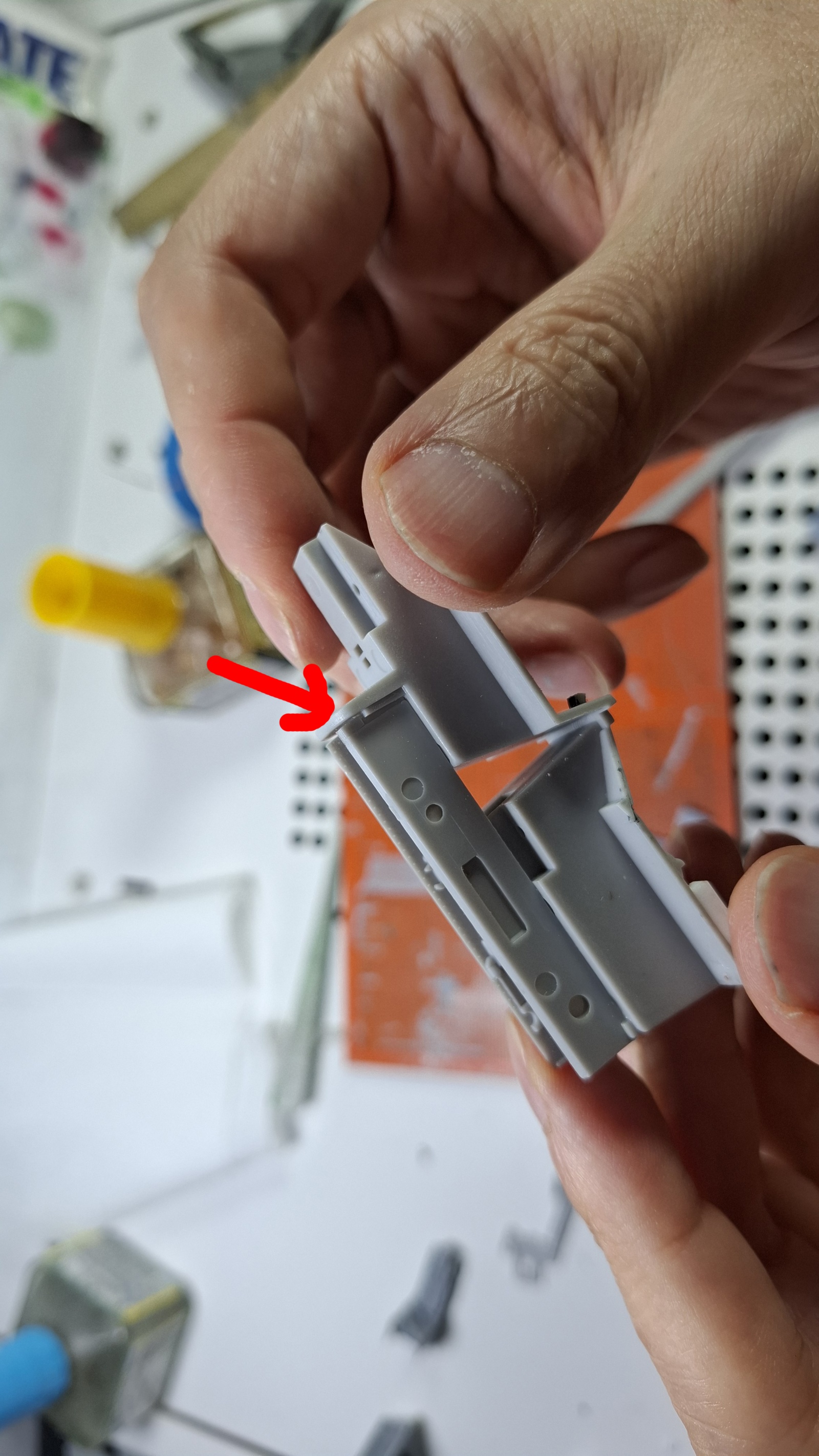 레벨킷의 배스텁과 노즈기어 베이입니다. 적색 화살표는 배스텁 부품 하단에 일체형으로 사출된 노즈기어베이의 전방 격벽인데요