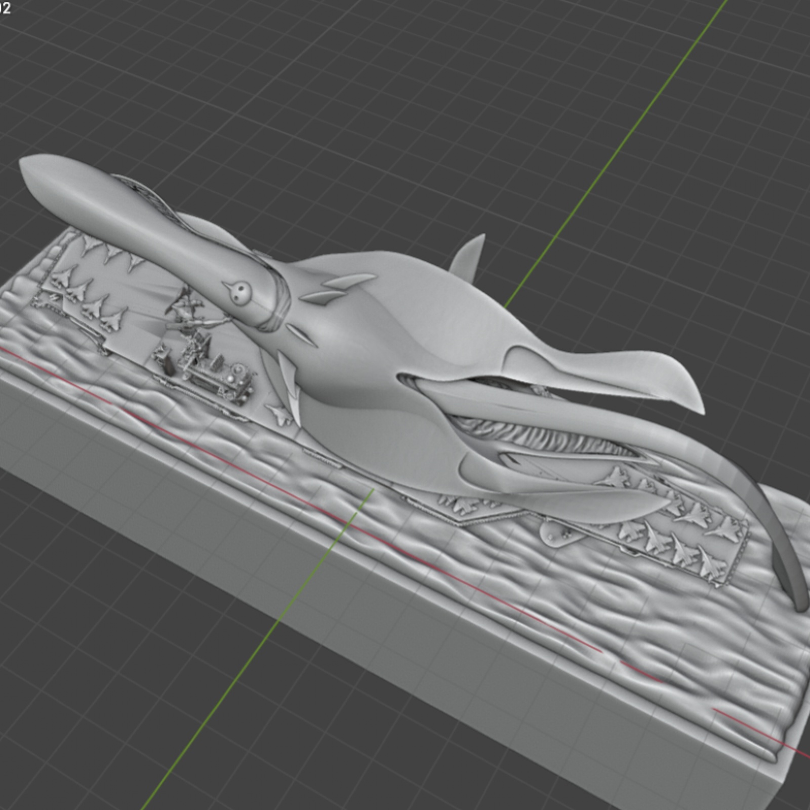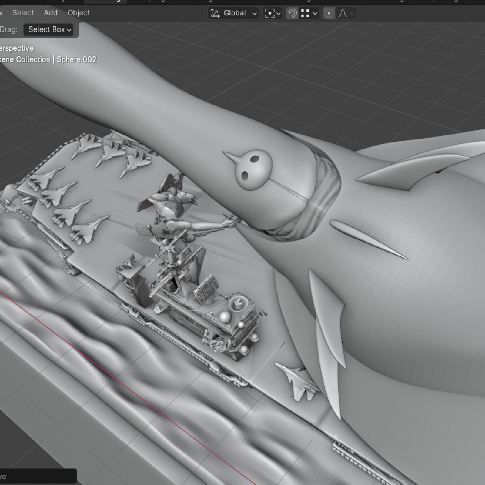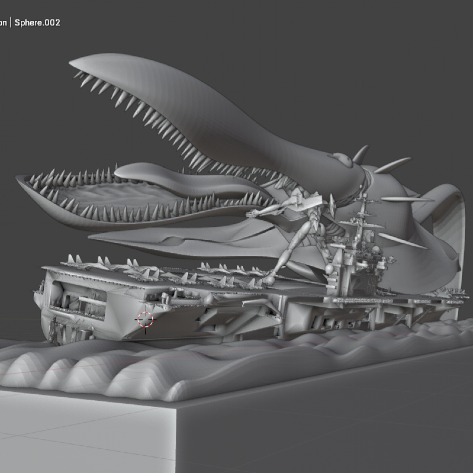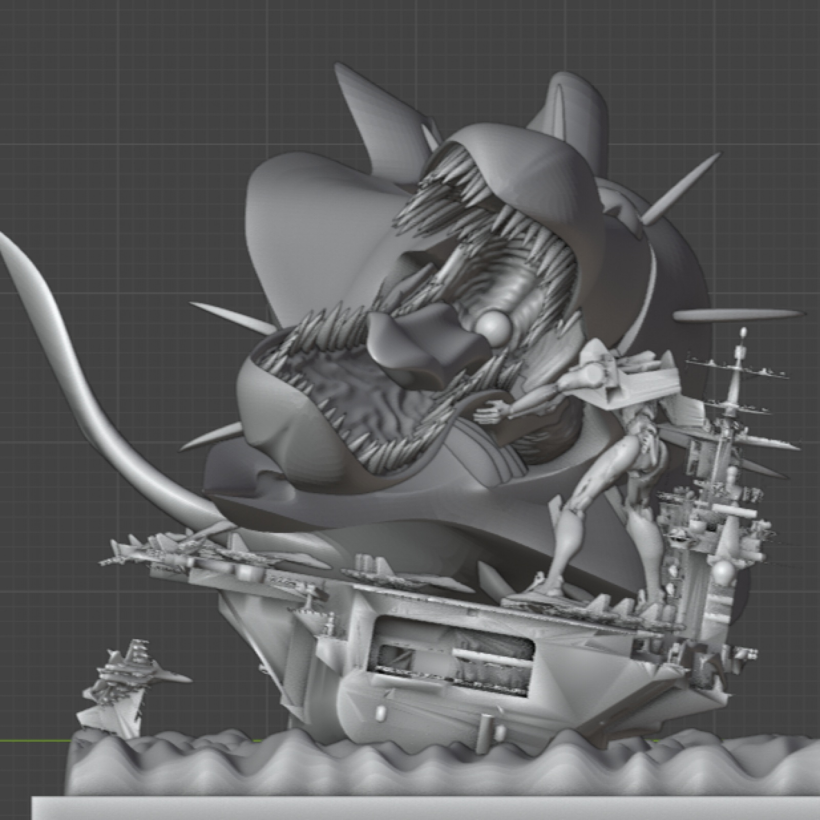 이제 구상중인 디오라마 최종편 입니다. 바다는 대충 만들긴 했으나 블렌더서 제작 가능합니다. 니미츠급 항모는 STL 파일입니다. 함재기는 SU33 에 가까운것 같은데 역시 파일을 다운받았습니다. 몇대는 바다로 빠지고 있고, 몇대는 폴리곤을 움직여 우그러지고 뒤틀린 모습으로...가기엘은 폴리곤을 이리저리 움직여 포즈를 바꾸어주었습니다. 애니에서는 항모 위에서는 입을 벌리지 않았던것 같으나 그래도 이빨을 보여주는게 더 괴수적인 느낌이 나서 놔두었습니다. SU33은 랜딩기어 추가, 에바 동력케이블도 추가하고 에바 STL 파일도 손을 좀 봐야 하겠지만 이 작업은 여기서 끝내려 합니다. 다음작품으로 찾아뵙겠습니다.