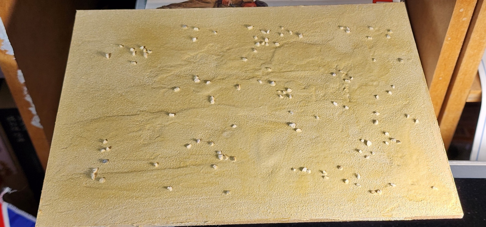 그러는 사이 미리 베이스판도 조금 만져줍니다. 간단하게 남는 타미야 디오라마 텍스처 이펙트를 발라주고 물을 좀 뿌려준 후 손가락으로 다듬고 위에 작은 돌을 살짝 뿌렸습니다. 이제 여러가지 피그먼트나 유화 등등으로 톤을 계속 마음에 들때까지 부분 부분 낮춰주고 잔디도 나중에 심고 미군 조종사도 올려줄겁니다.