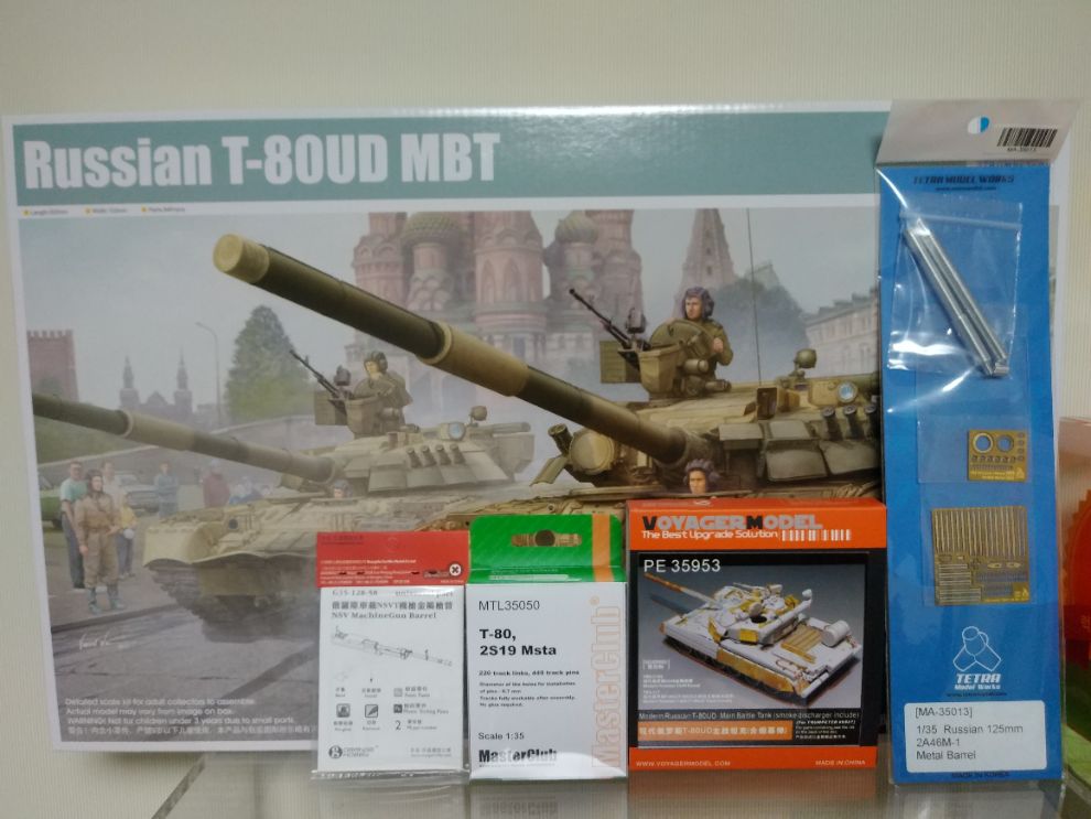 사진에서 보이는 바와 같이 Trumpeter 1/35 T-80UD, 메탈 포신 및 트랙, 보이저 전용 에칭 제품들을 세트로 분양합니다~
