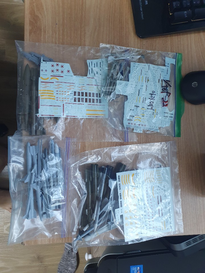 1/32 1/48 무장들 기본도색되있고 맞는데칼들 지퍼백에 각각 담아놓은거 4봉지랑
