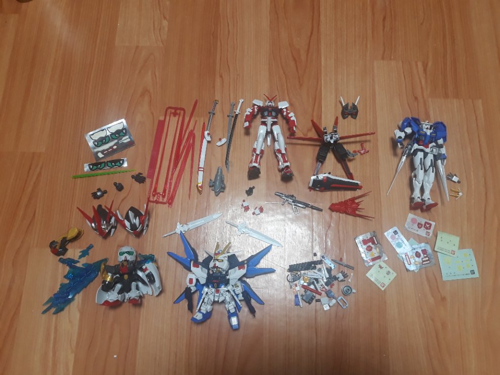 1.건담 : HG아스트레이 레드프레임과 그 외의 추가 장비들, 부스터와 로봇의 등과 연결하는 후크는 부러졌습니다.(사진참고) HG더블오건담, SD와룡전사? SD에일 스트라이크건담? 나머지 스티커들과 자잘한 부품들 사진에 보이는 그대로 드립니다.